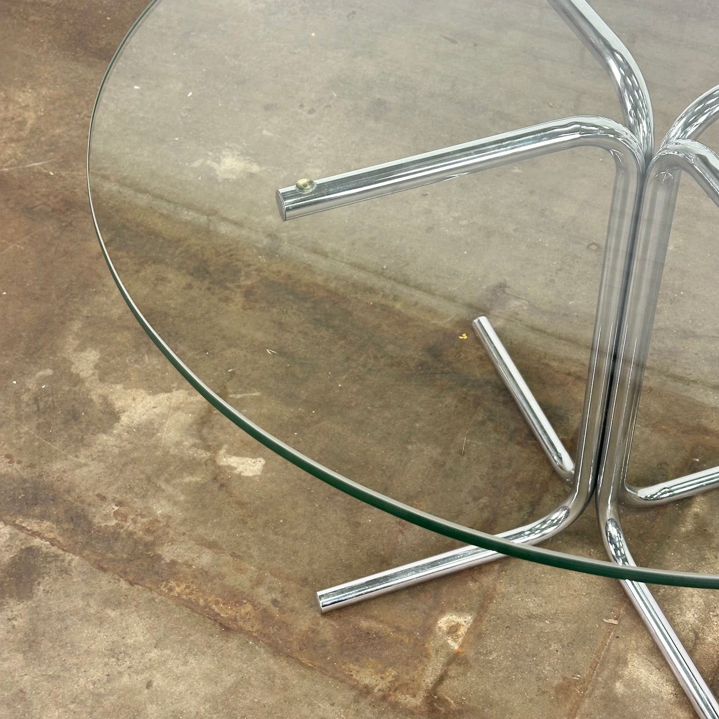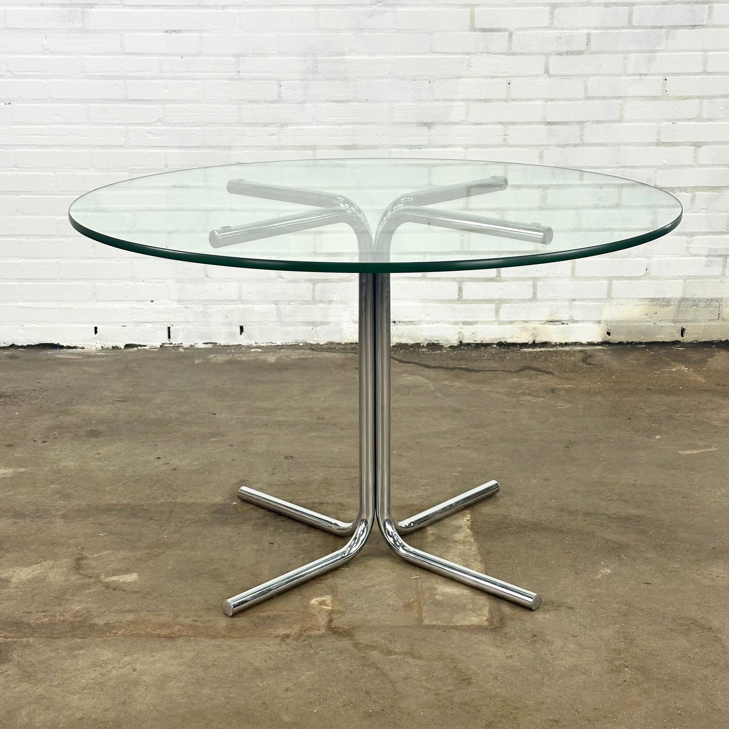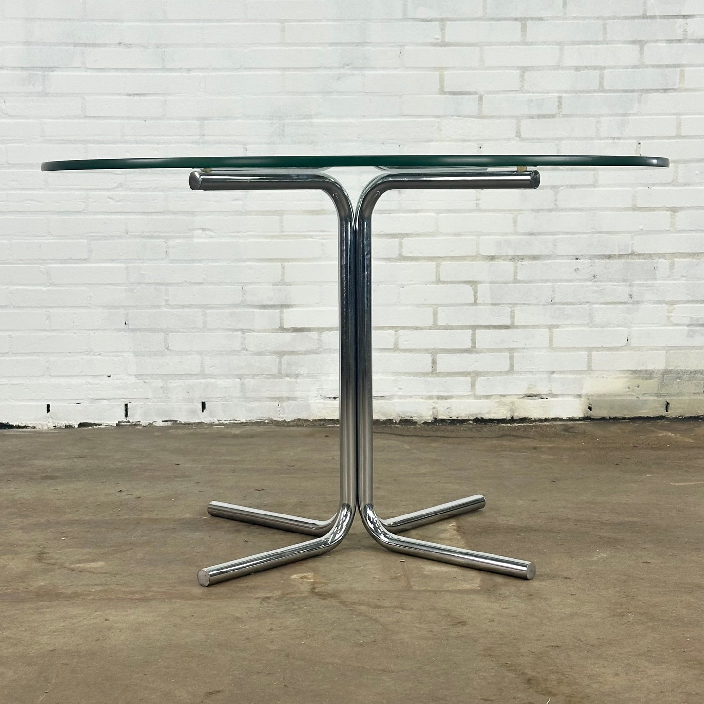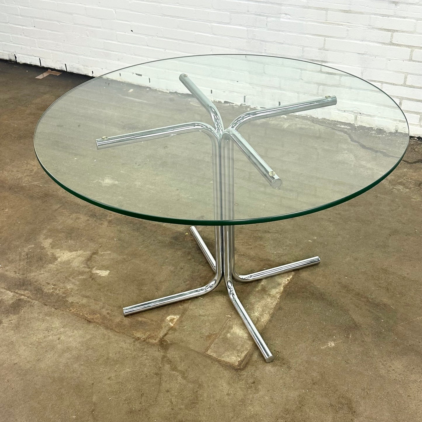 Omschrijving: Italiaanse ronde vintage eettafel met glazen blad en buisframe onderstel