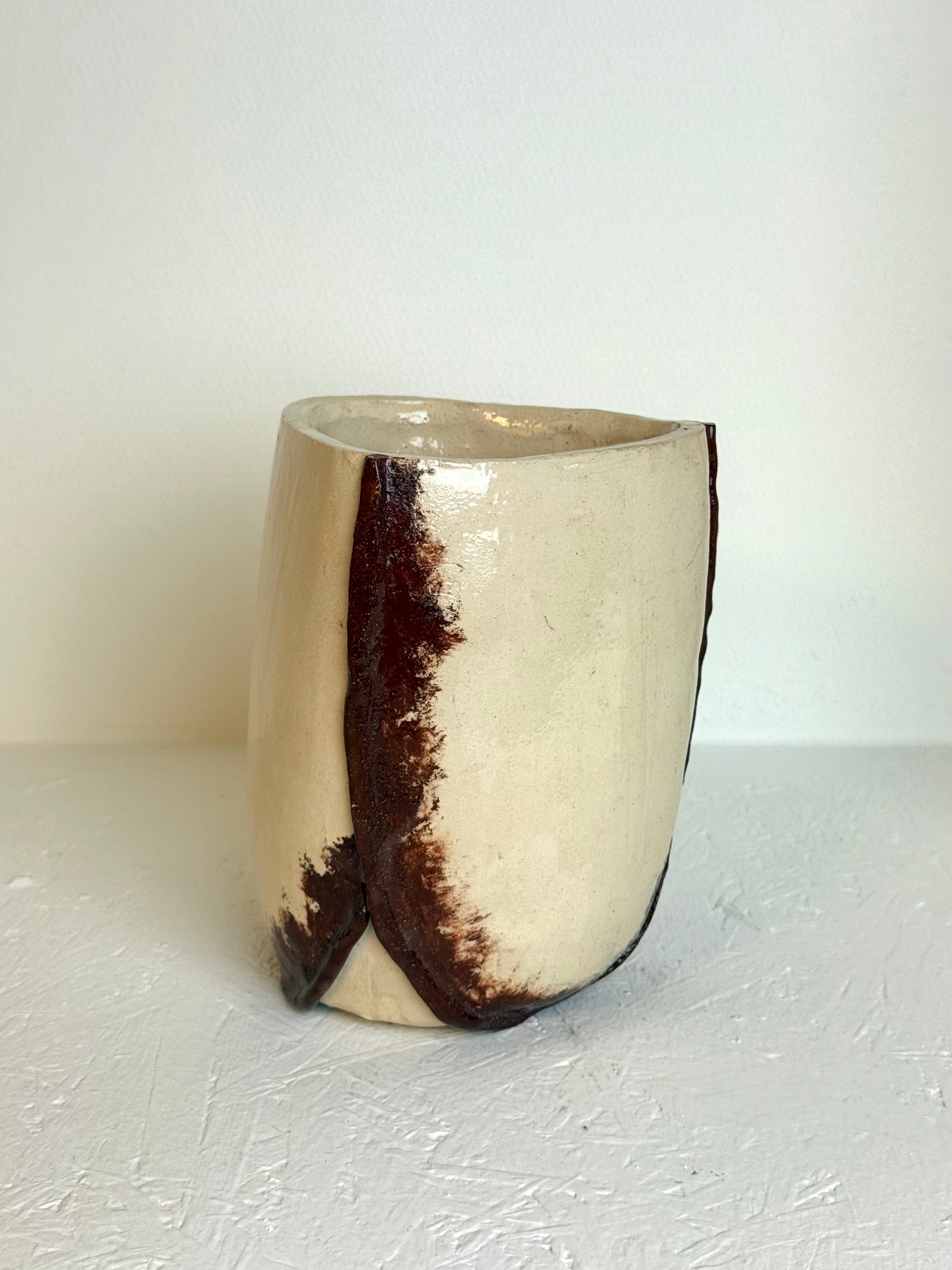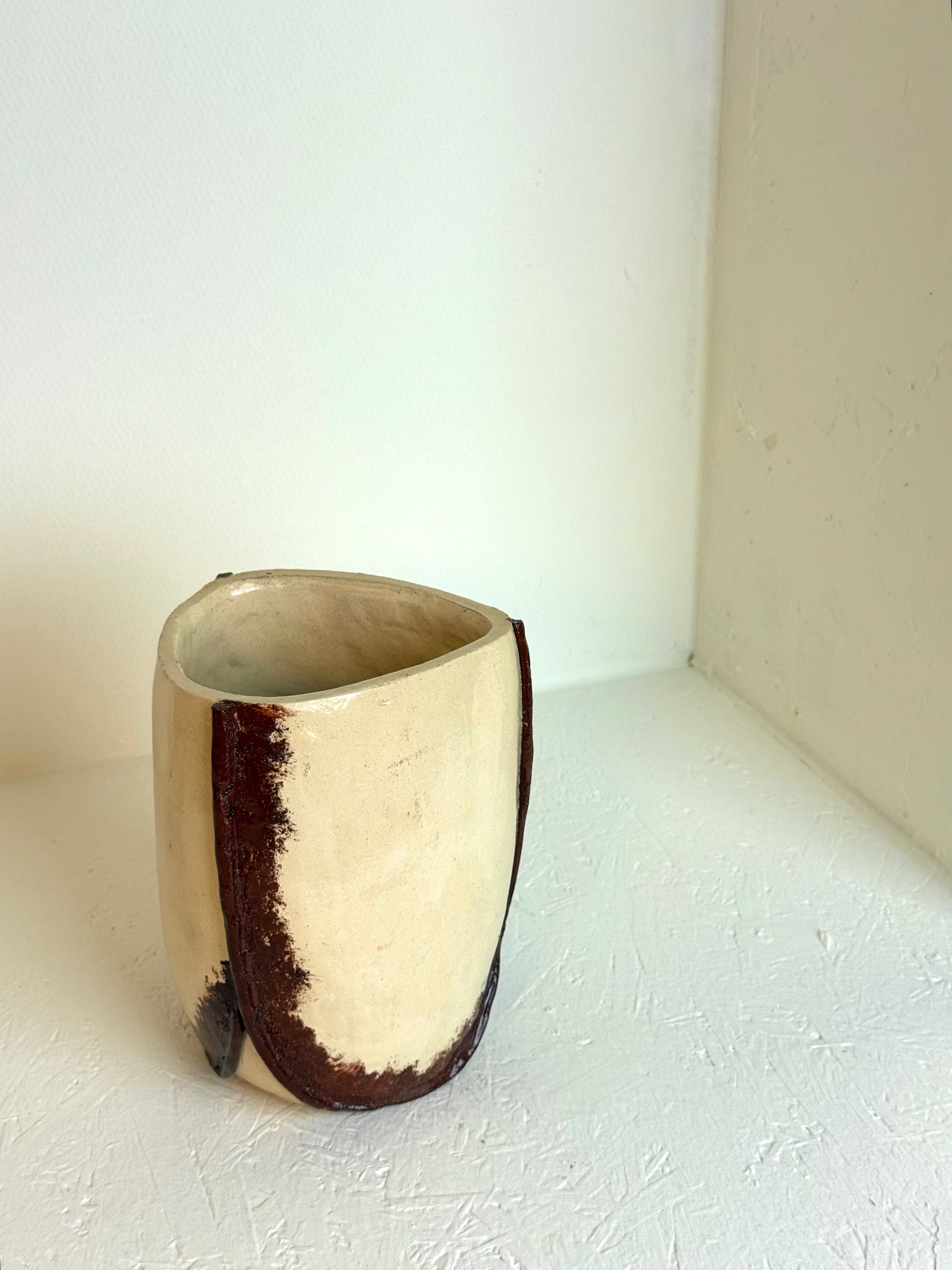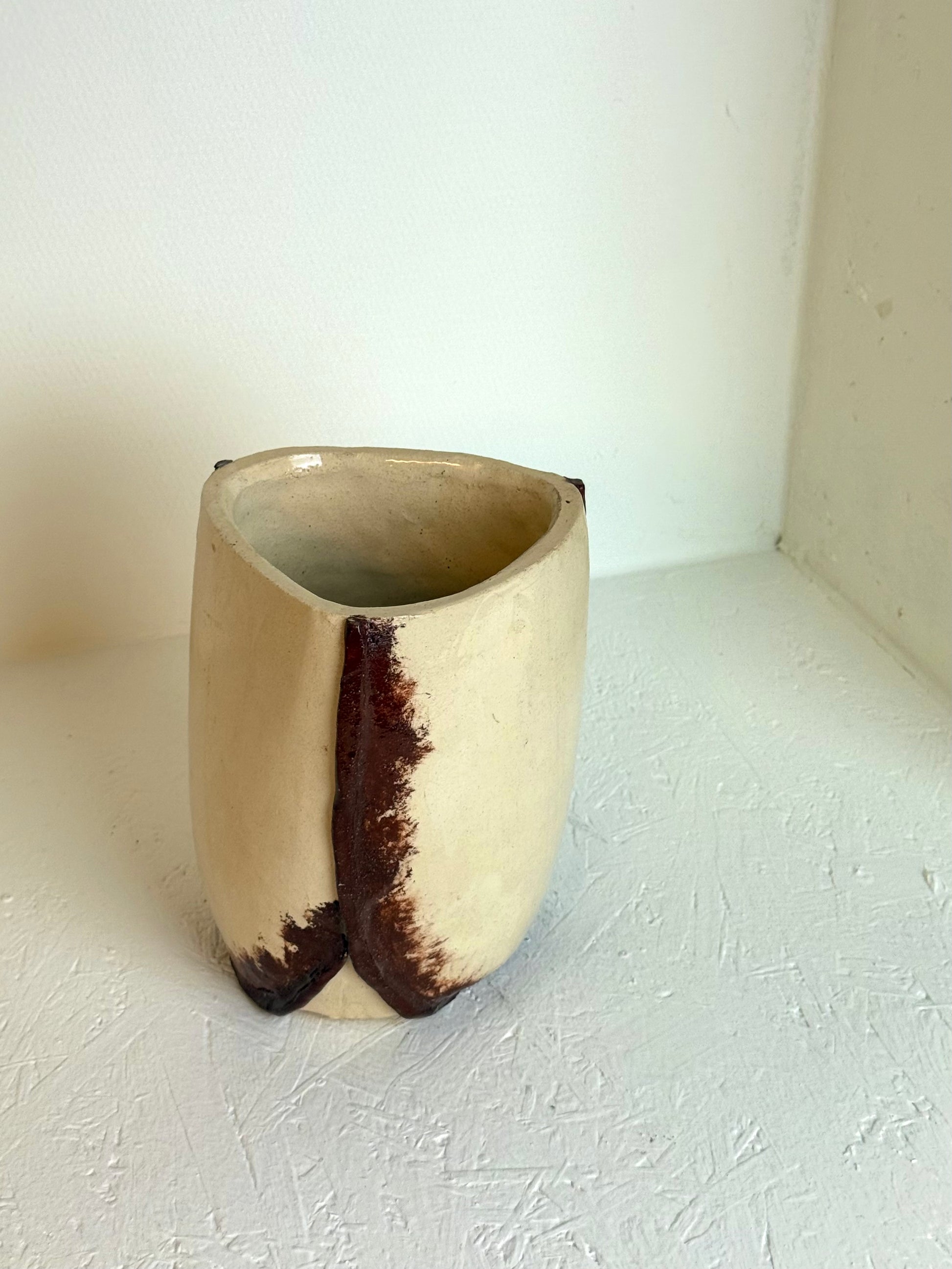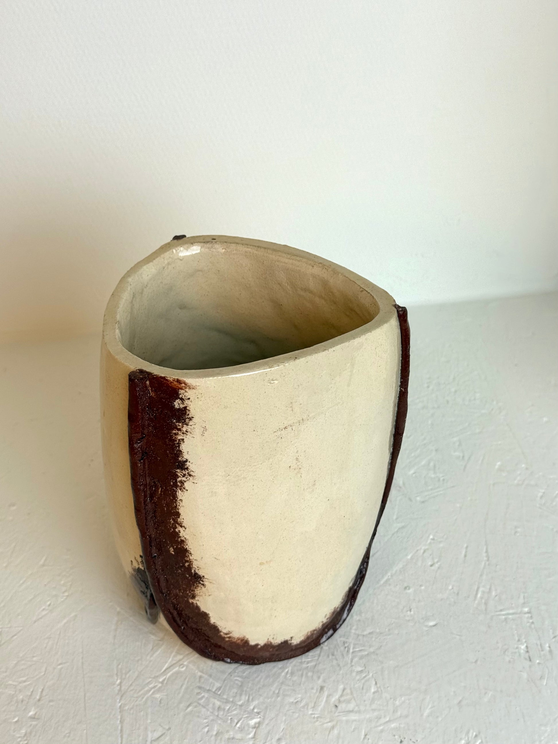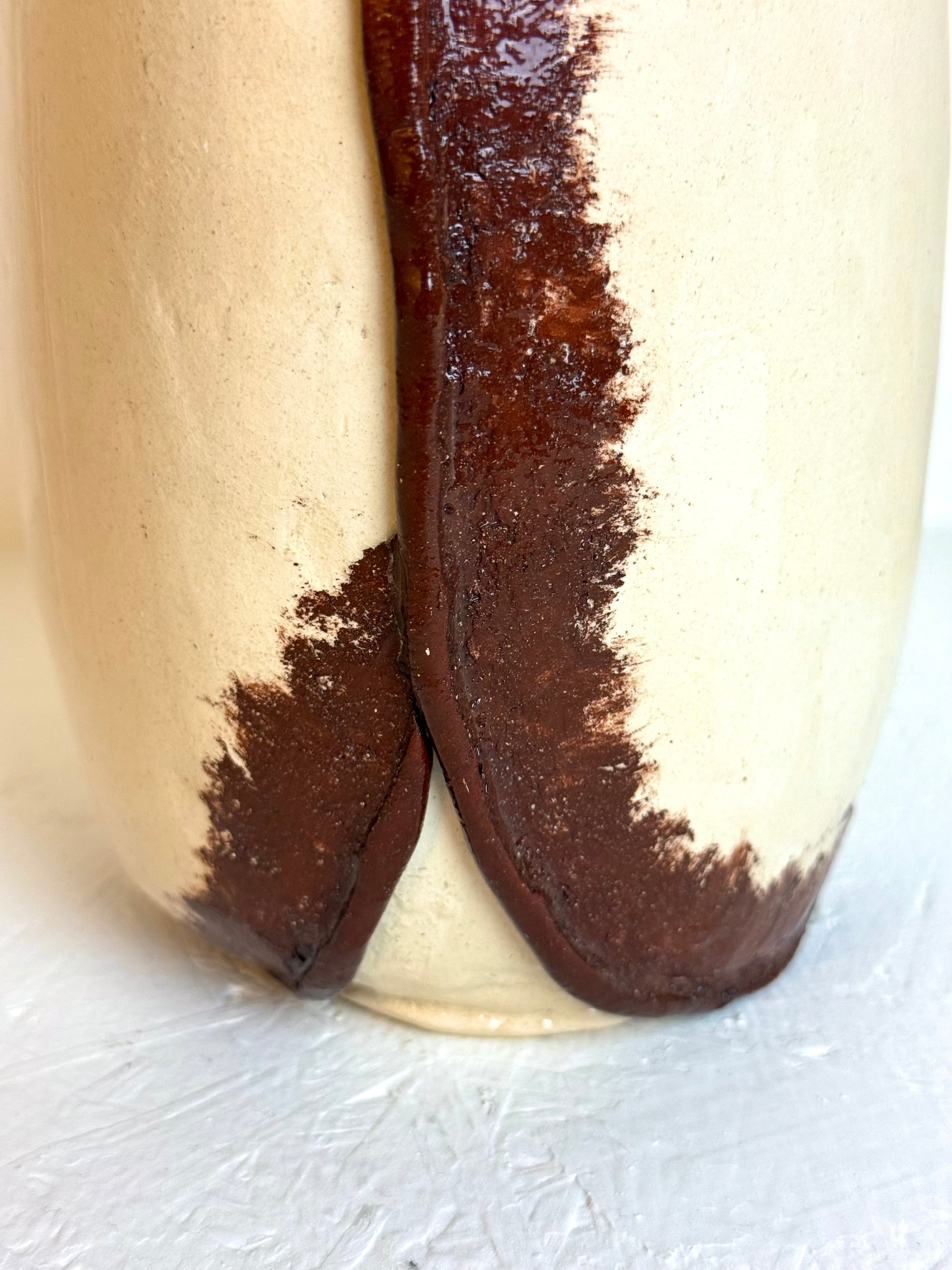Vintage handgemaakt crèmekleurige & bruine vaas
