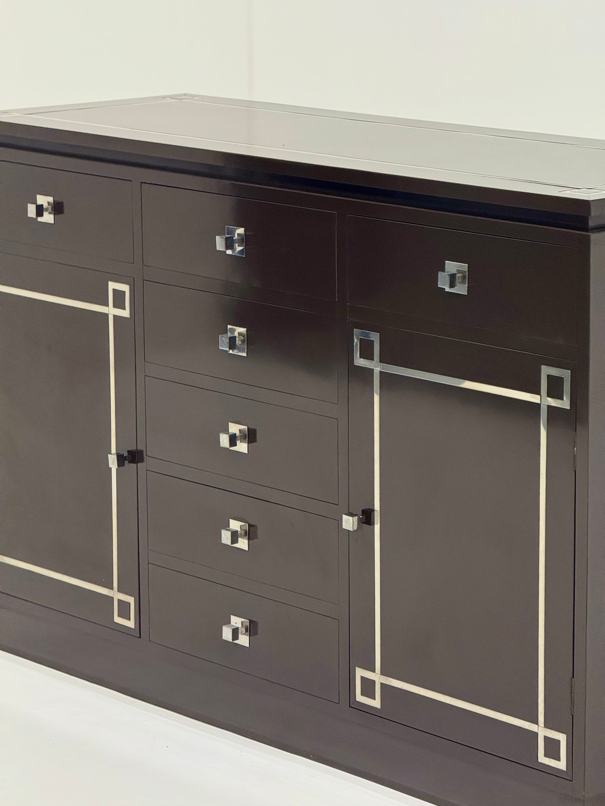 Het meubel is uitgevoerd in donkerbruin gelakt hout, wat het geheel een luxueuze, diepe glans geeft. De gepolijste stalen details accentueren de strakke lijnen van het ontwerp en geven het dressoir een moderne, bijna architectonische uitstraling.