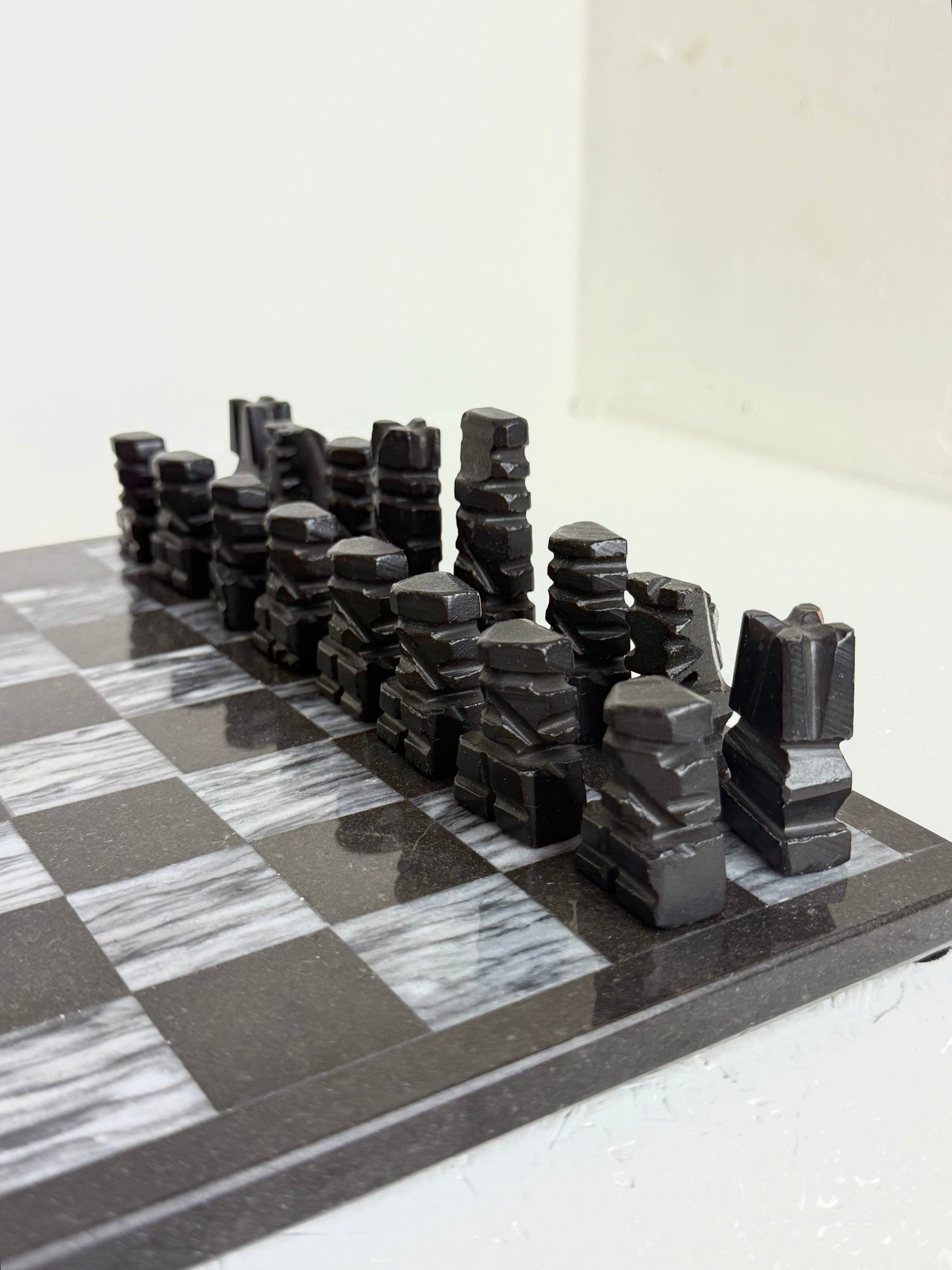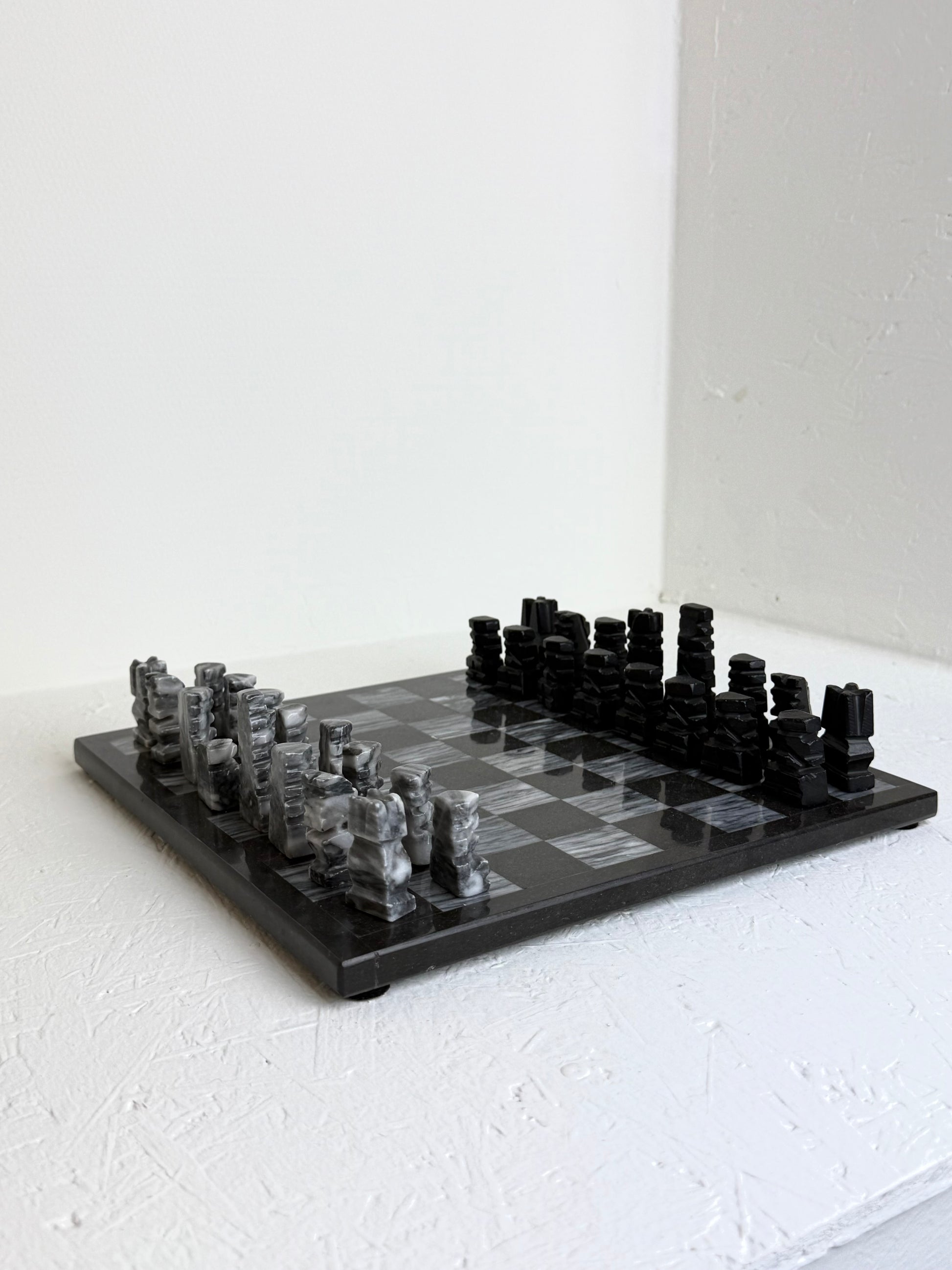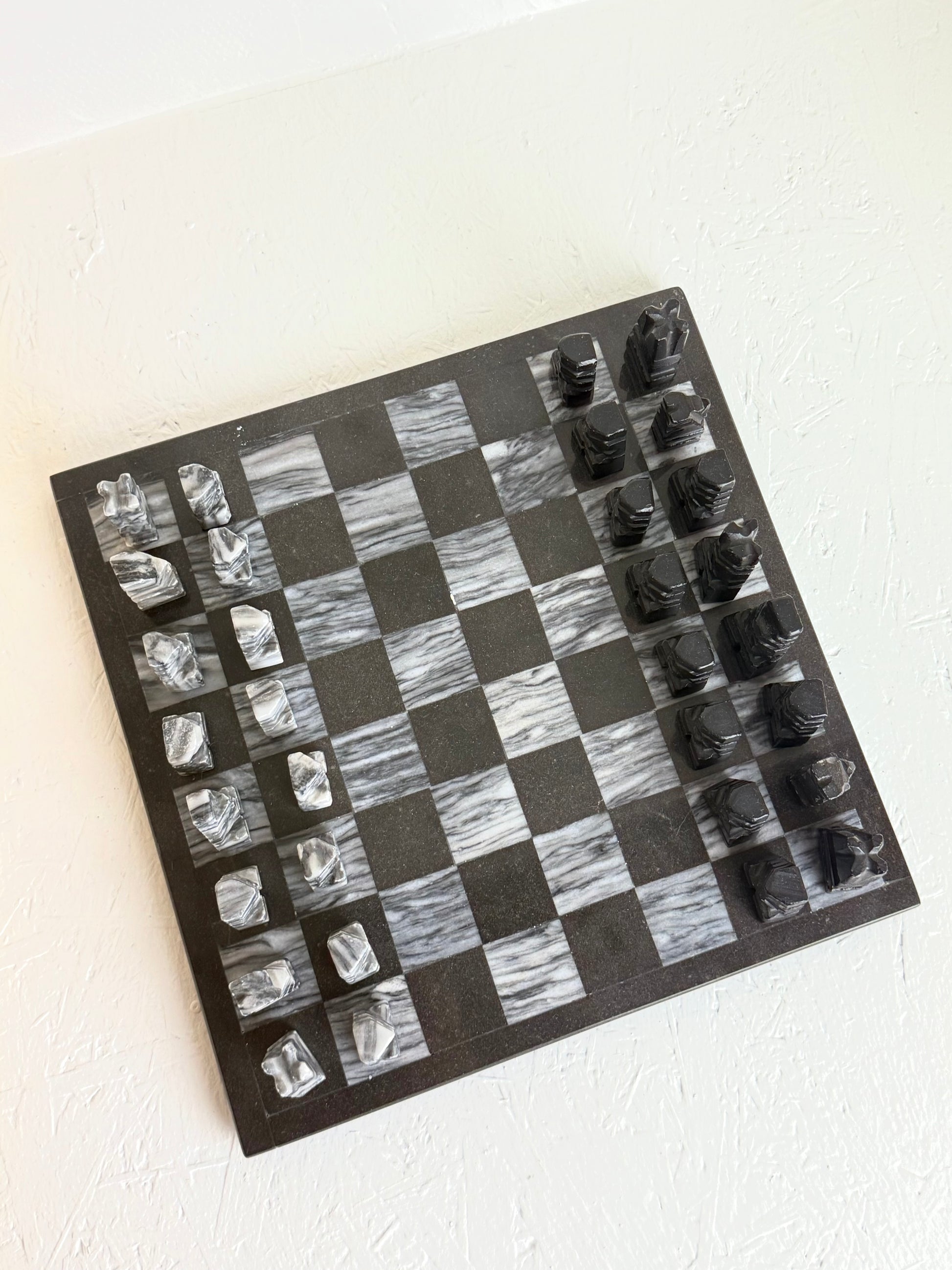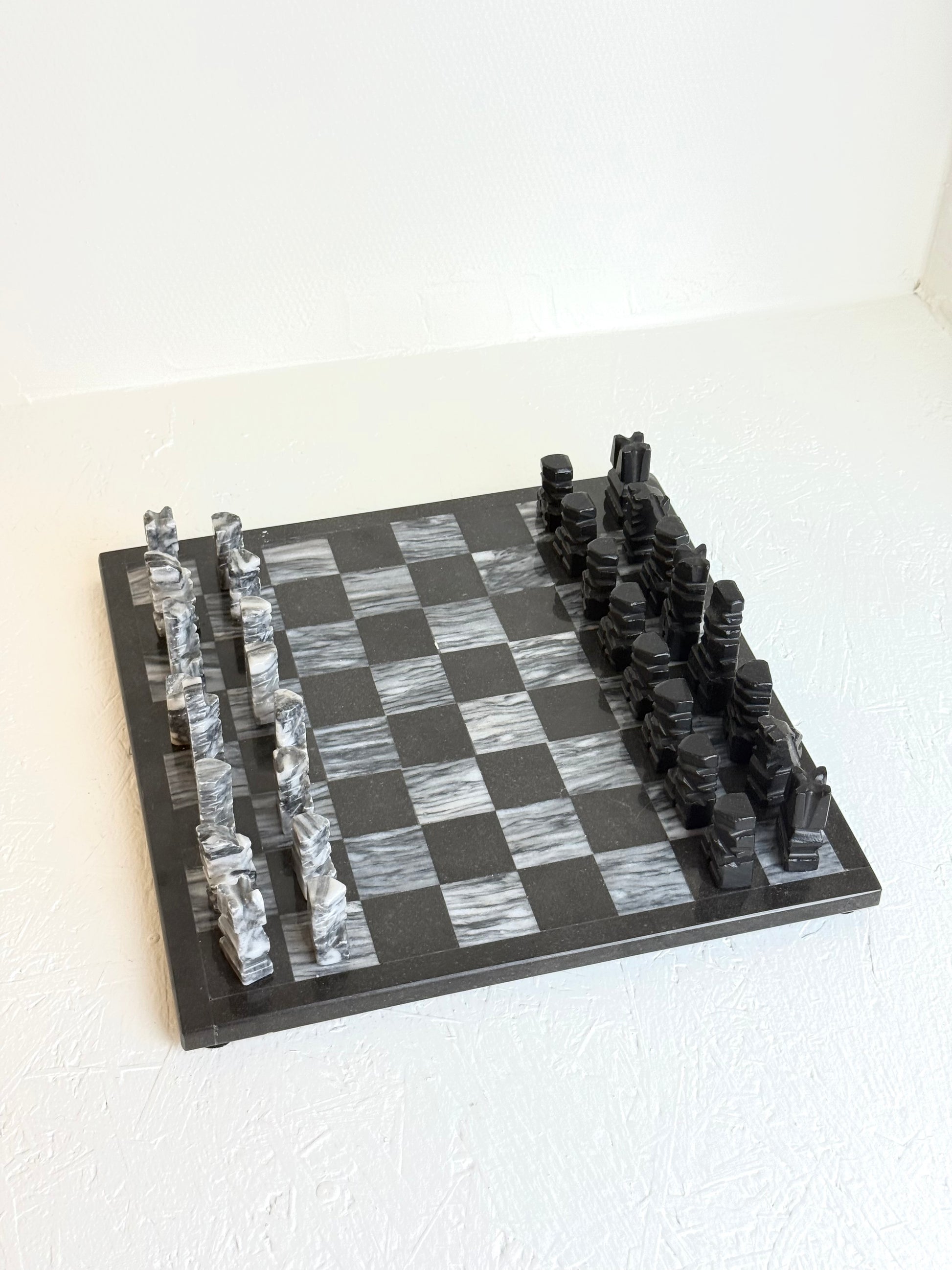 Dit vintage schaakbord is vervaardigd uit hoogwaardig marmer en combineert klassieke zwarte en witte vakken, wat zorgt voor een strak en tijdloos contrast. Het bord is niet alleen functioneel voor het spelen van een potje schaak, maar vormt ook een stijlvolle decoratie voor op tafel of in een interieur.