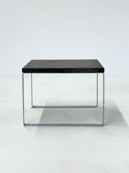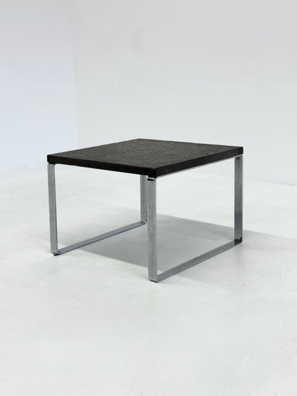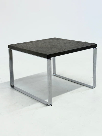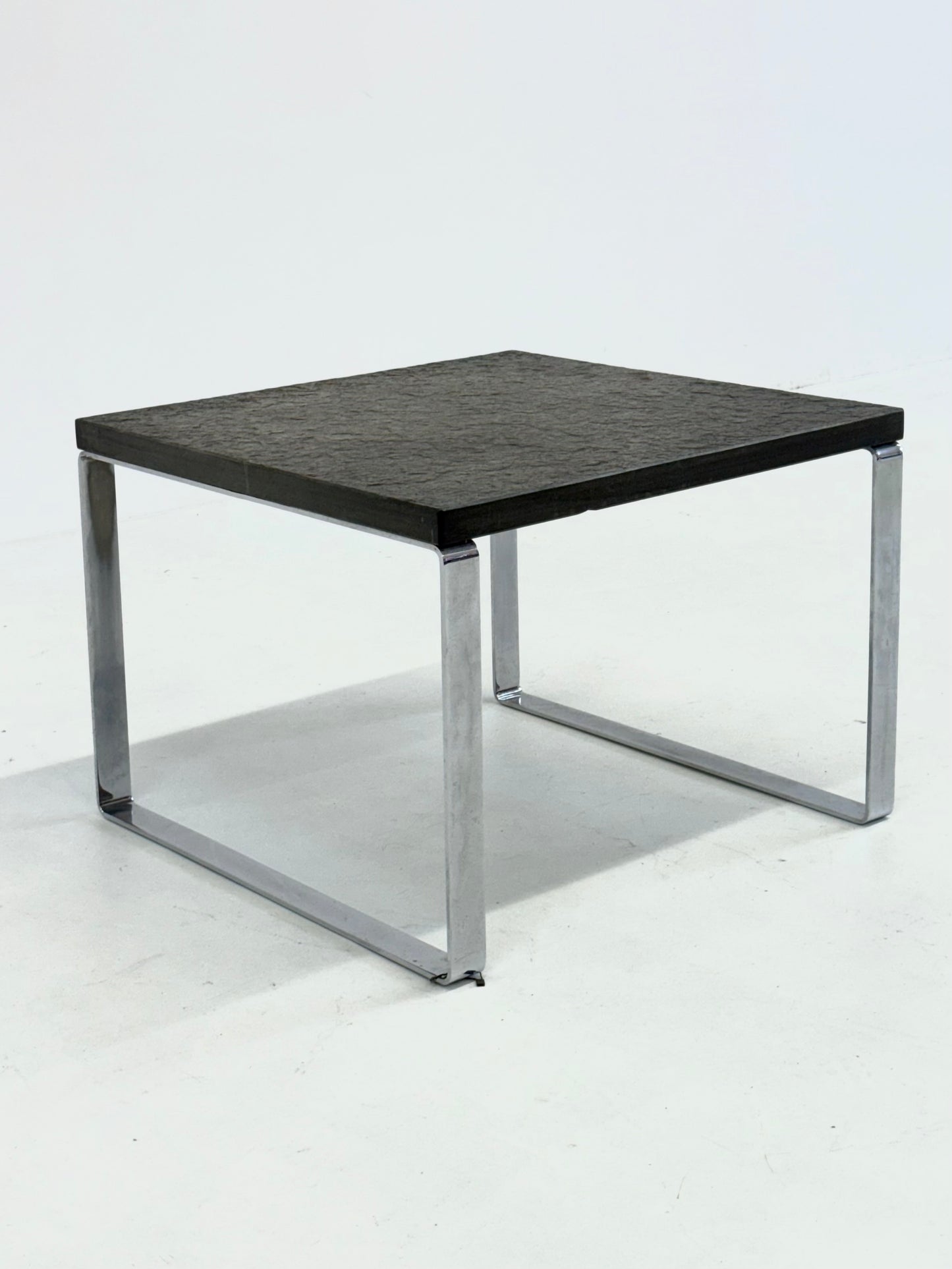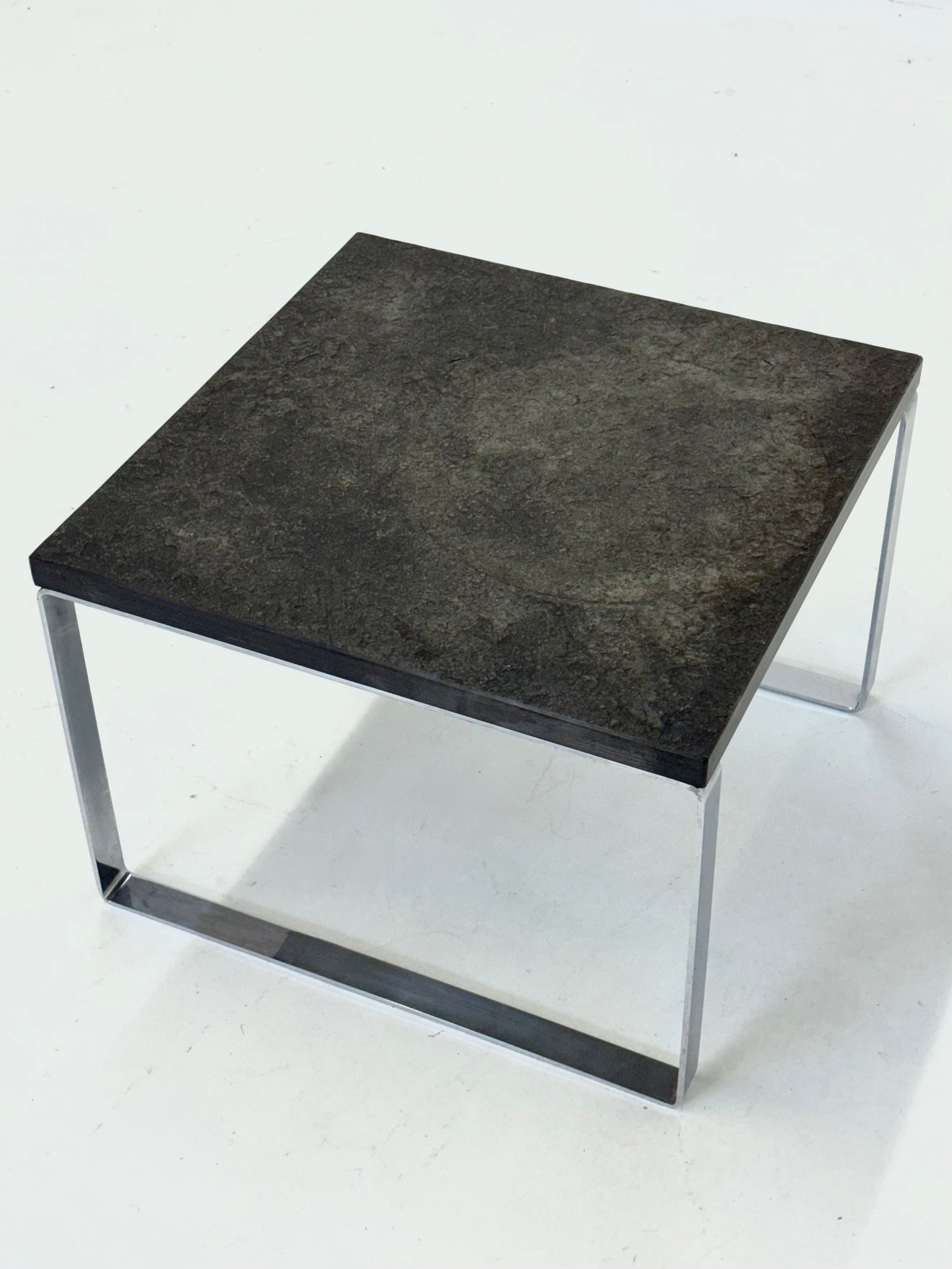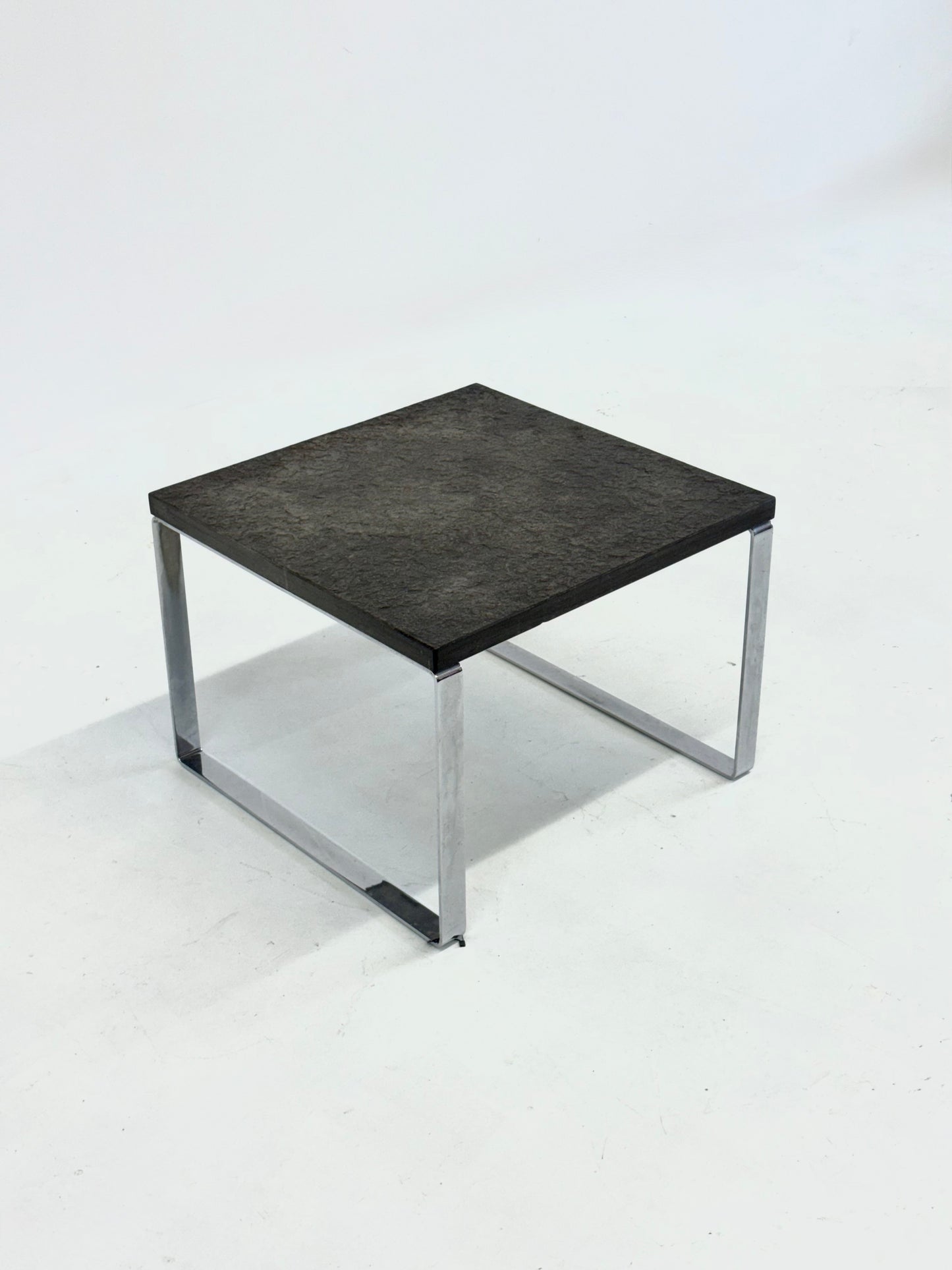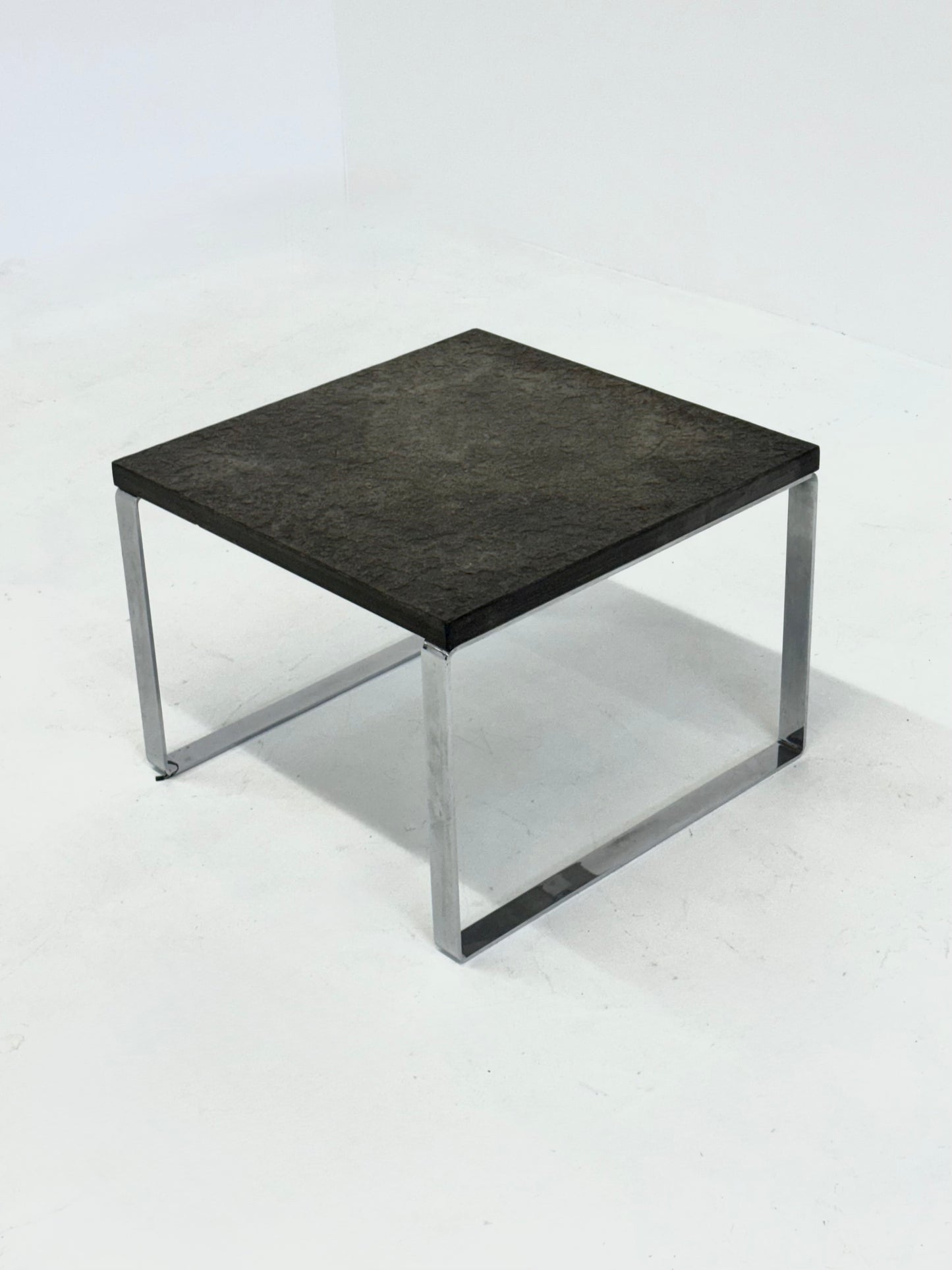 Bijzondere vierkante vintage salontafel in brutalistische stijl, met een robuust blad van natuurlijk leisteen en een strak verchroomd metalen onderstel. De tafel is een ontwerp van Peter Draenert, bekend om zijn gebruik van natuursteen en minimalistische lijnen. De ruwe textuur van het blad contrasteert prachtig met het strakke, industriële frame.