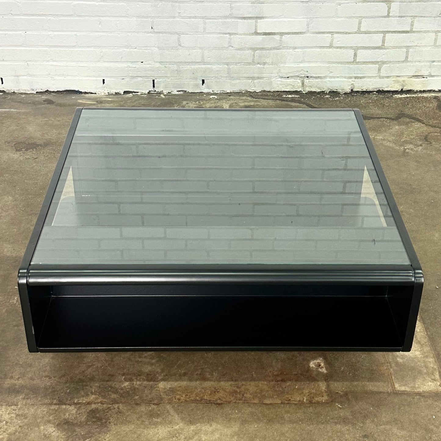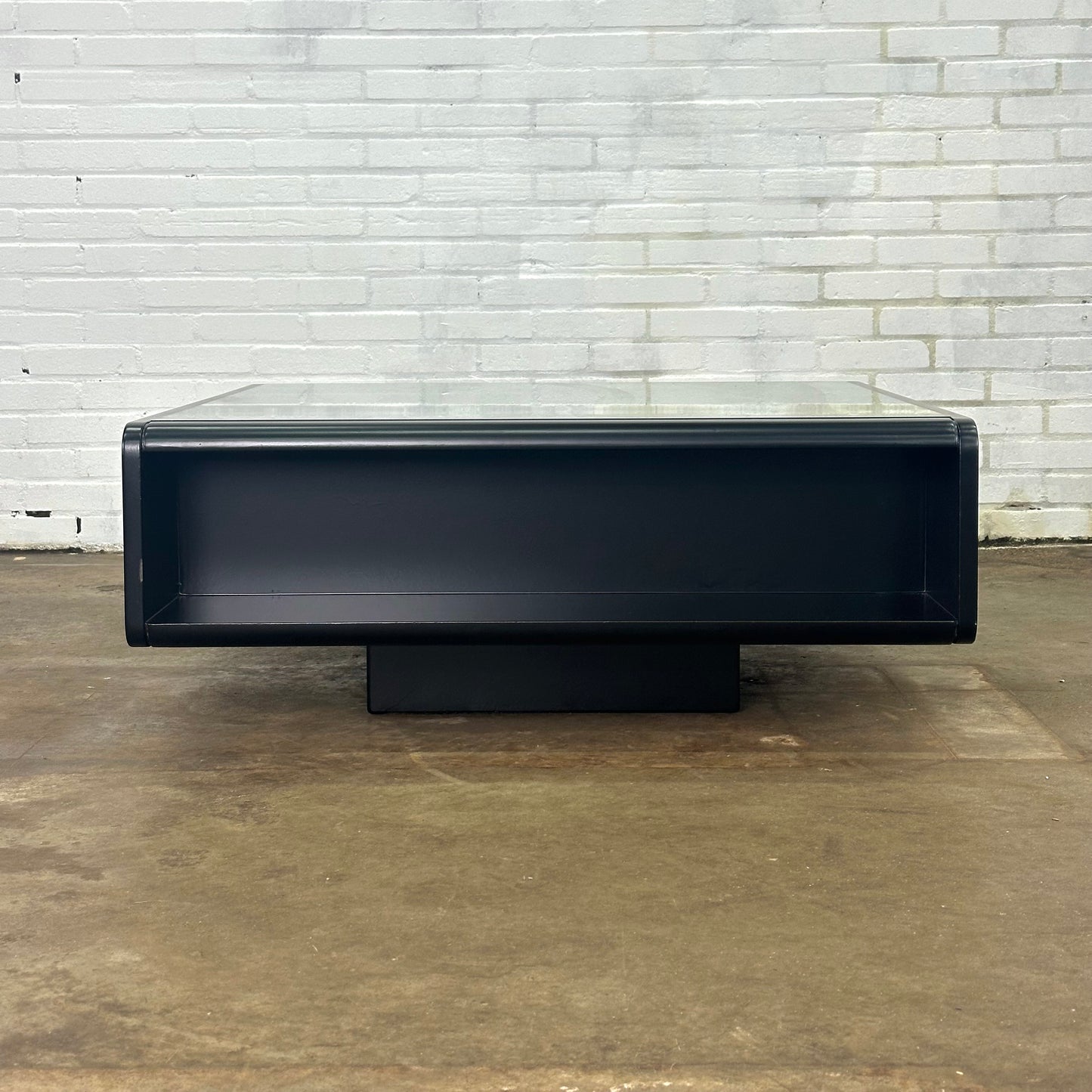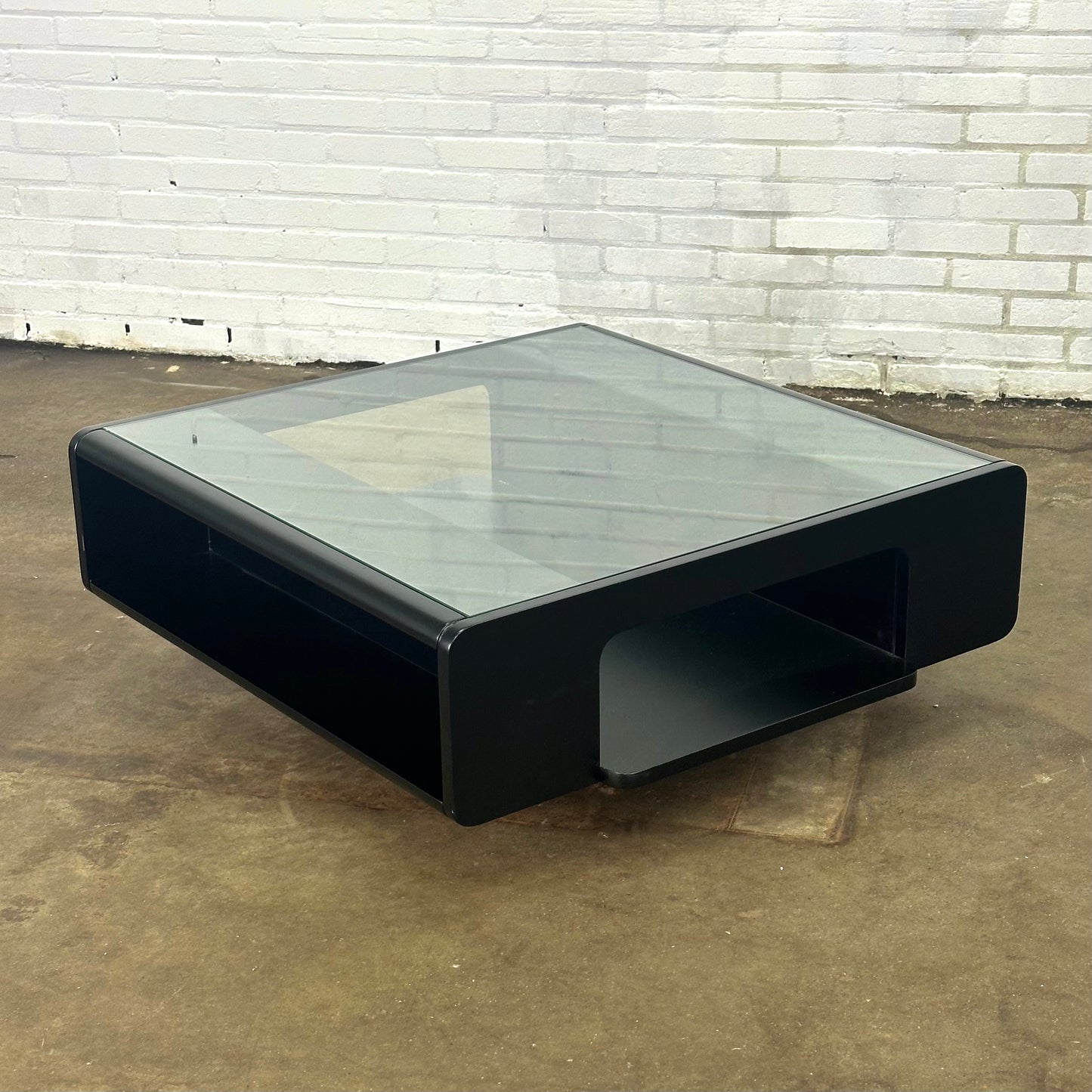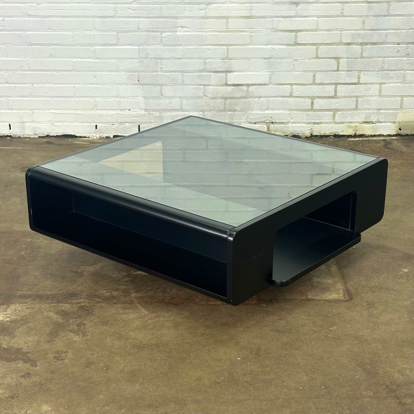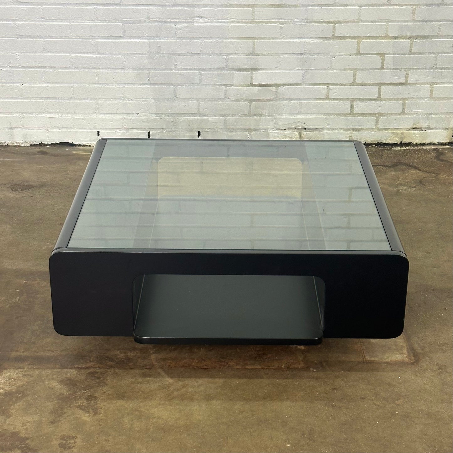 Deze vintage Space Age salontafel uit de jaren 70 heeft een gedurfd ontwerp met een houten frame en een glazen blad. Het ontwerp weerspiegelt de futuristische esthetiek van de Space Age, met elegante lijnen en een onderscheidende uitstraling.
