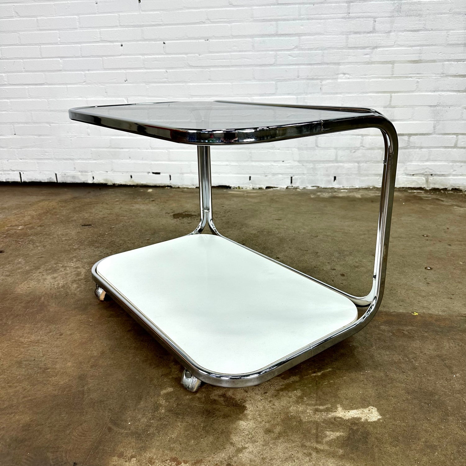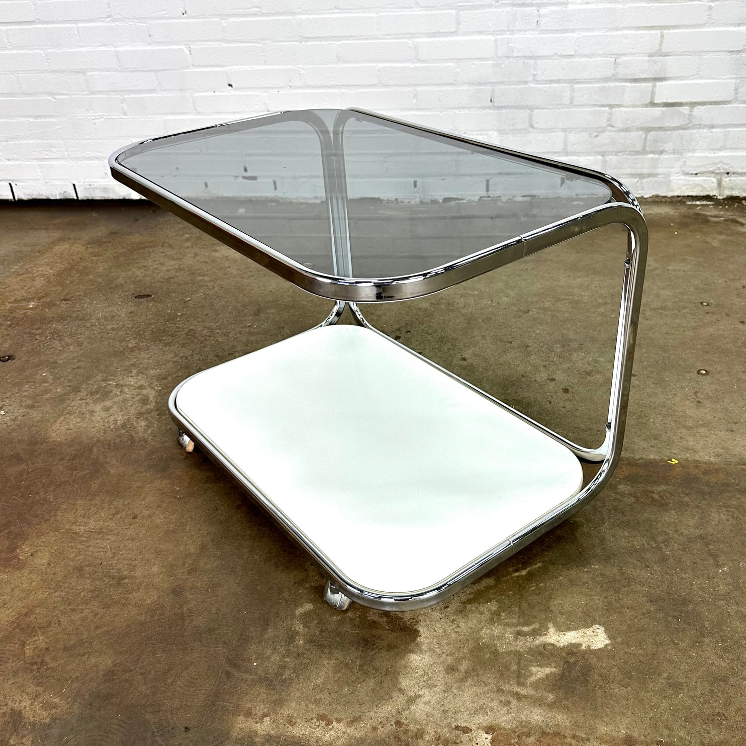 Omschrijving: Vintage space age trolley / bijzettafel. De trolley heeft een buisframe fame, de bovenste plank heeft rookglas en onder wit hout.