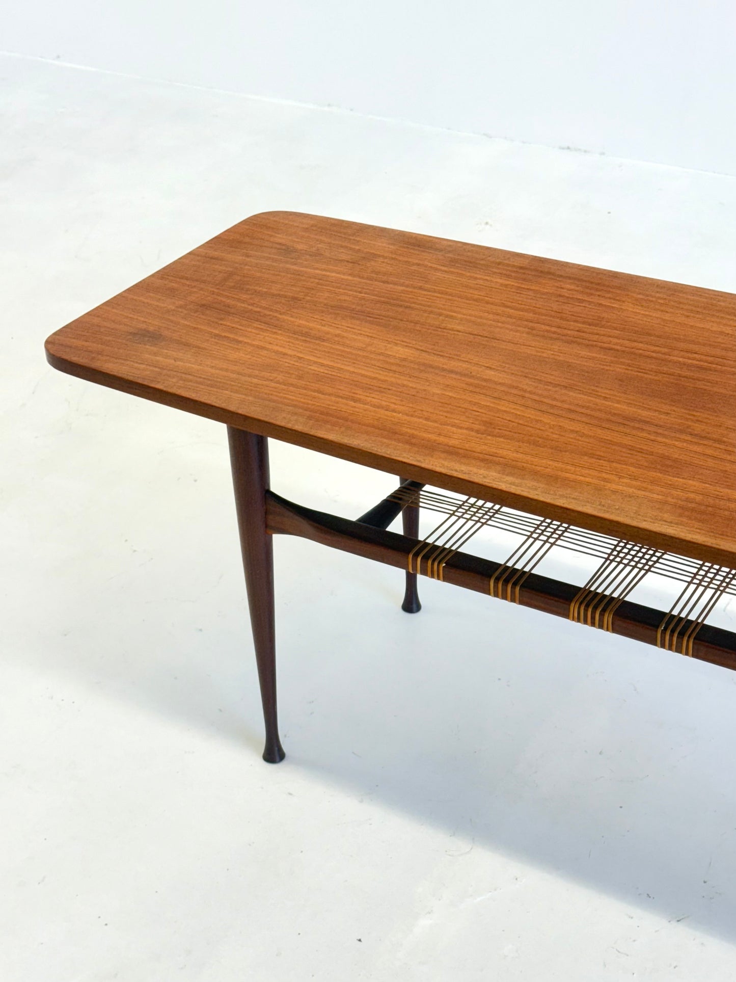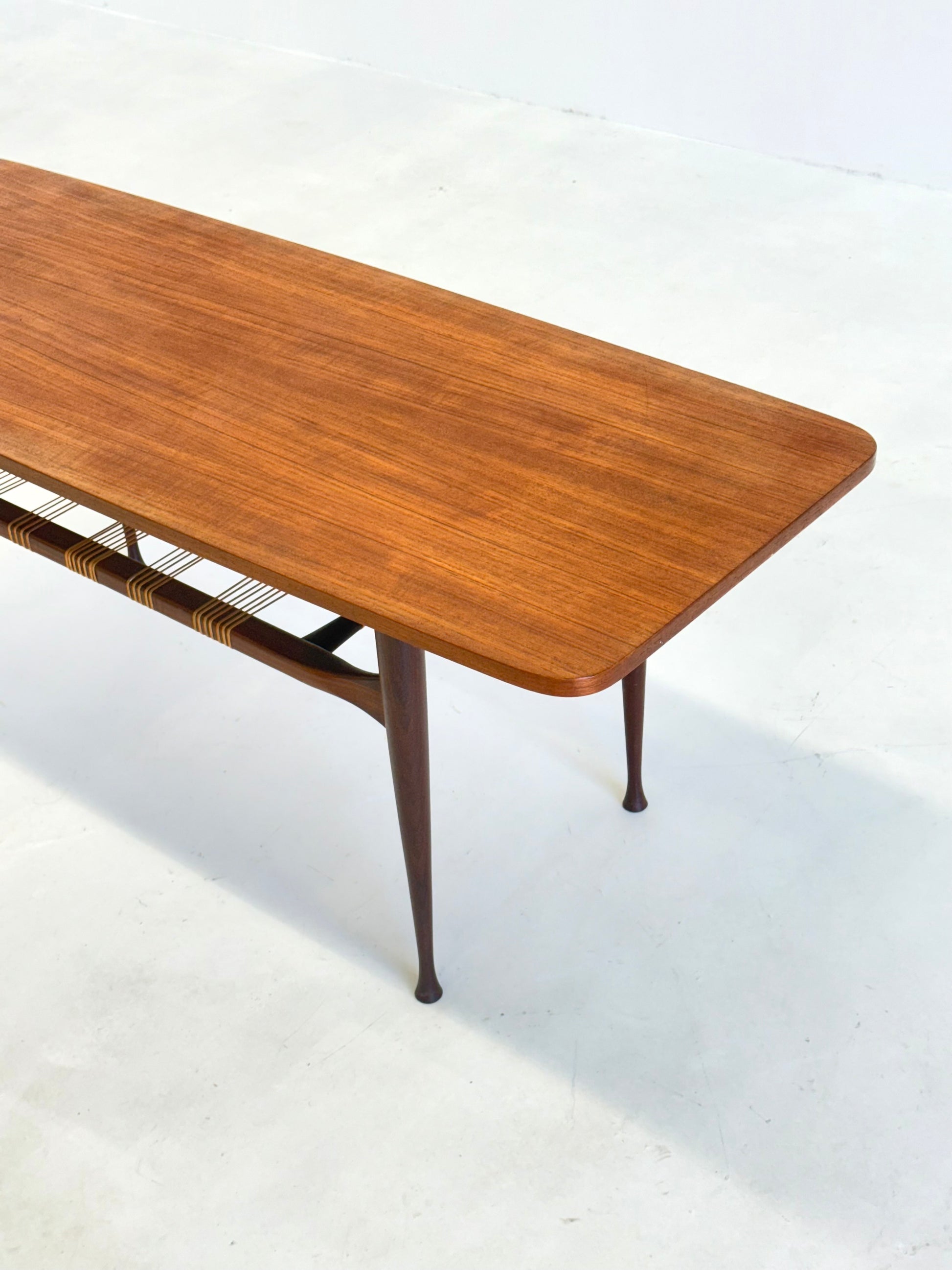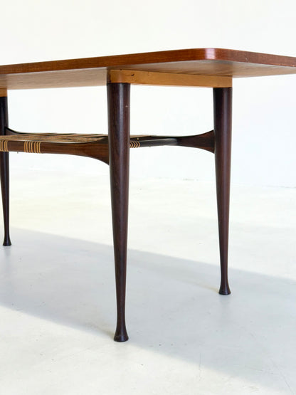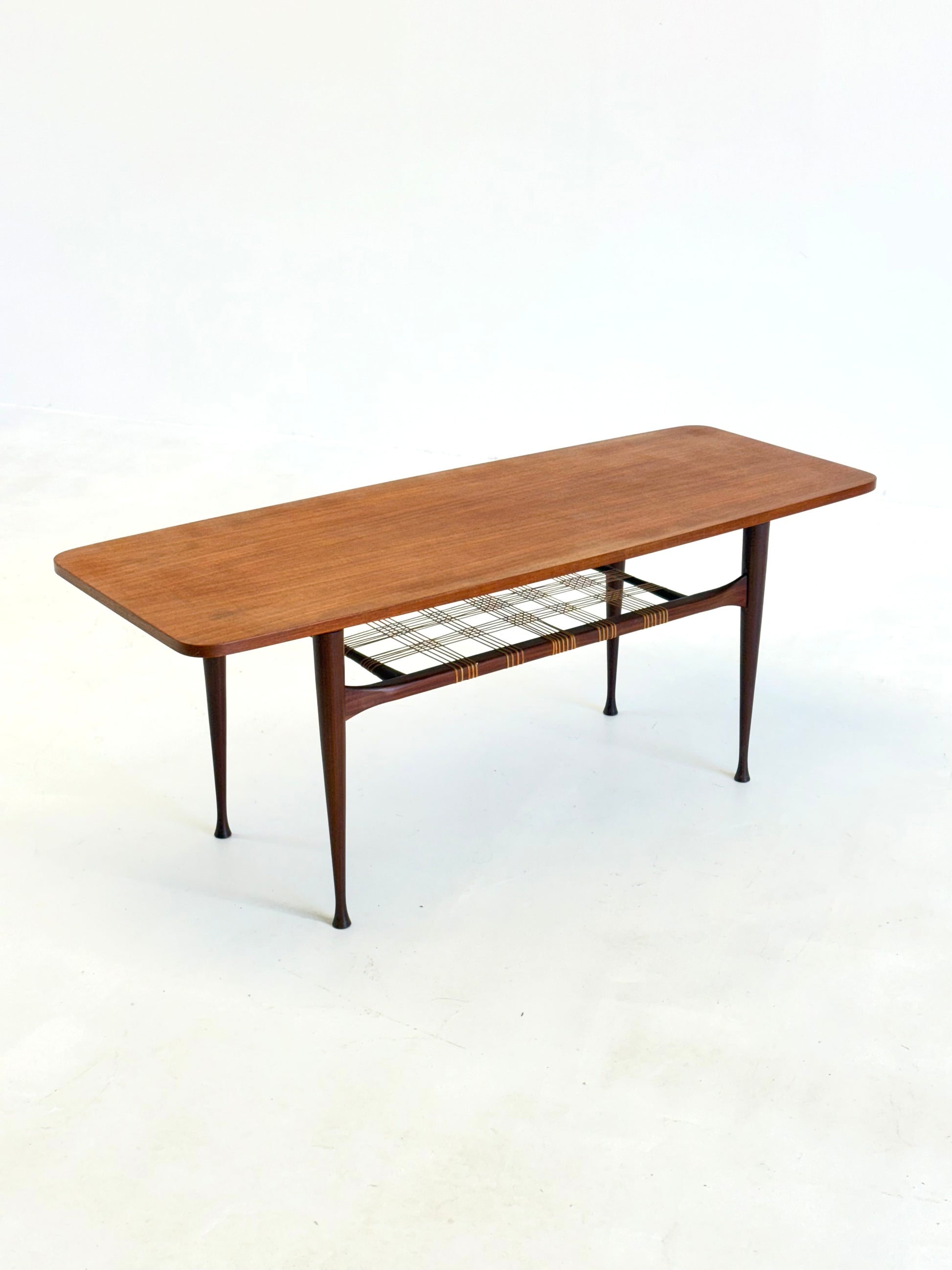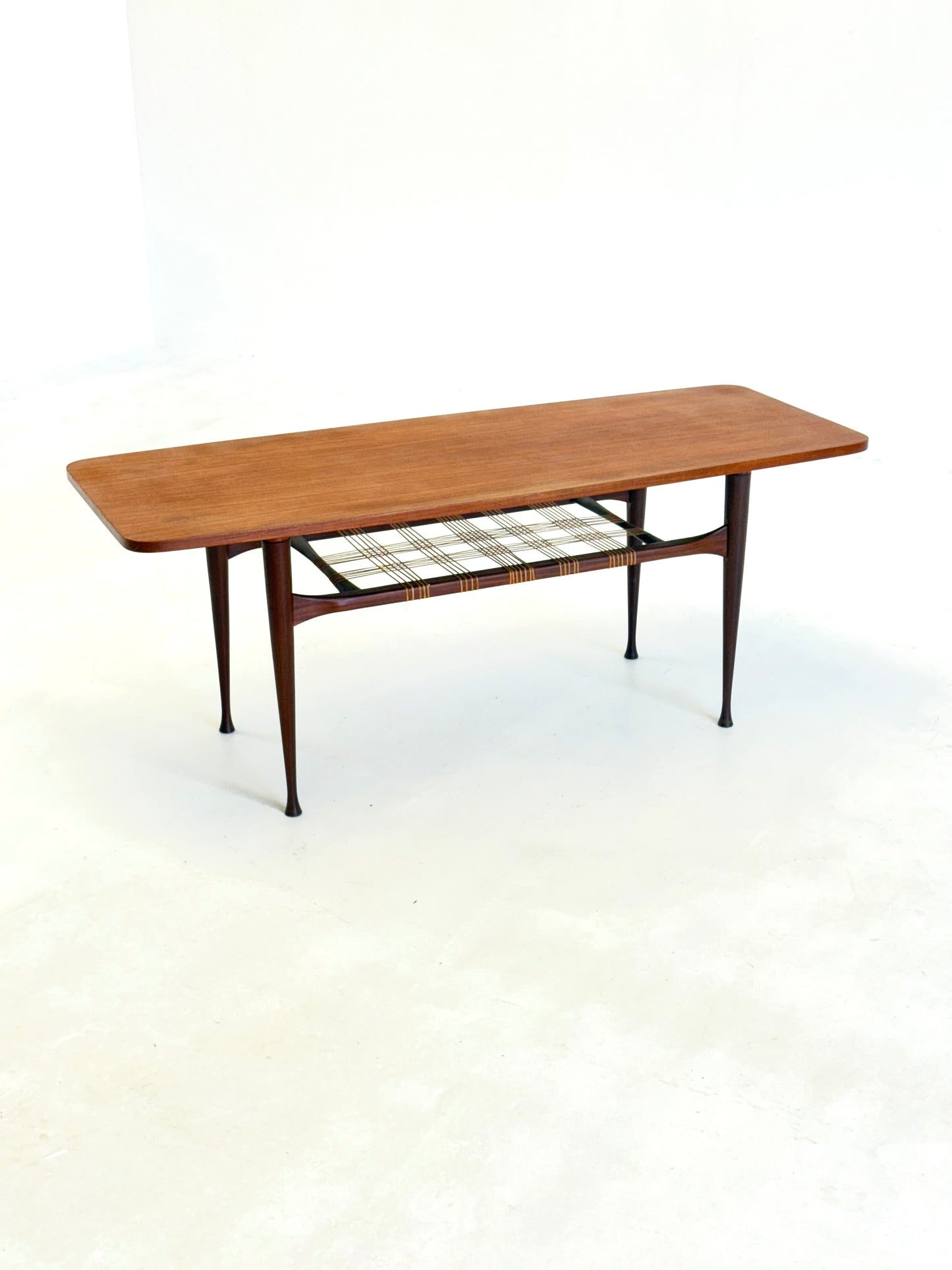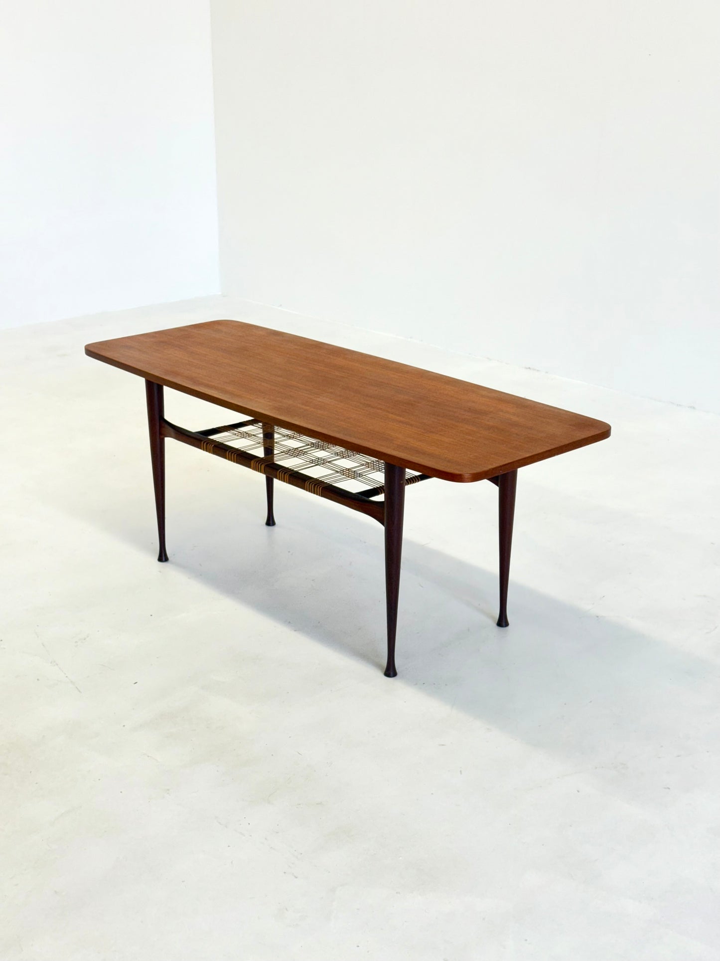 Omschrijving: Vintage salontafel afkomstig uit Denemarken, gemaakt in de jaren 60. de onderste plank heeft rotan stroken.