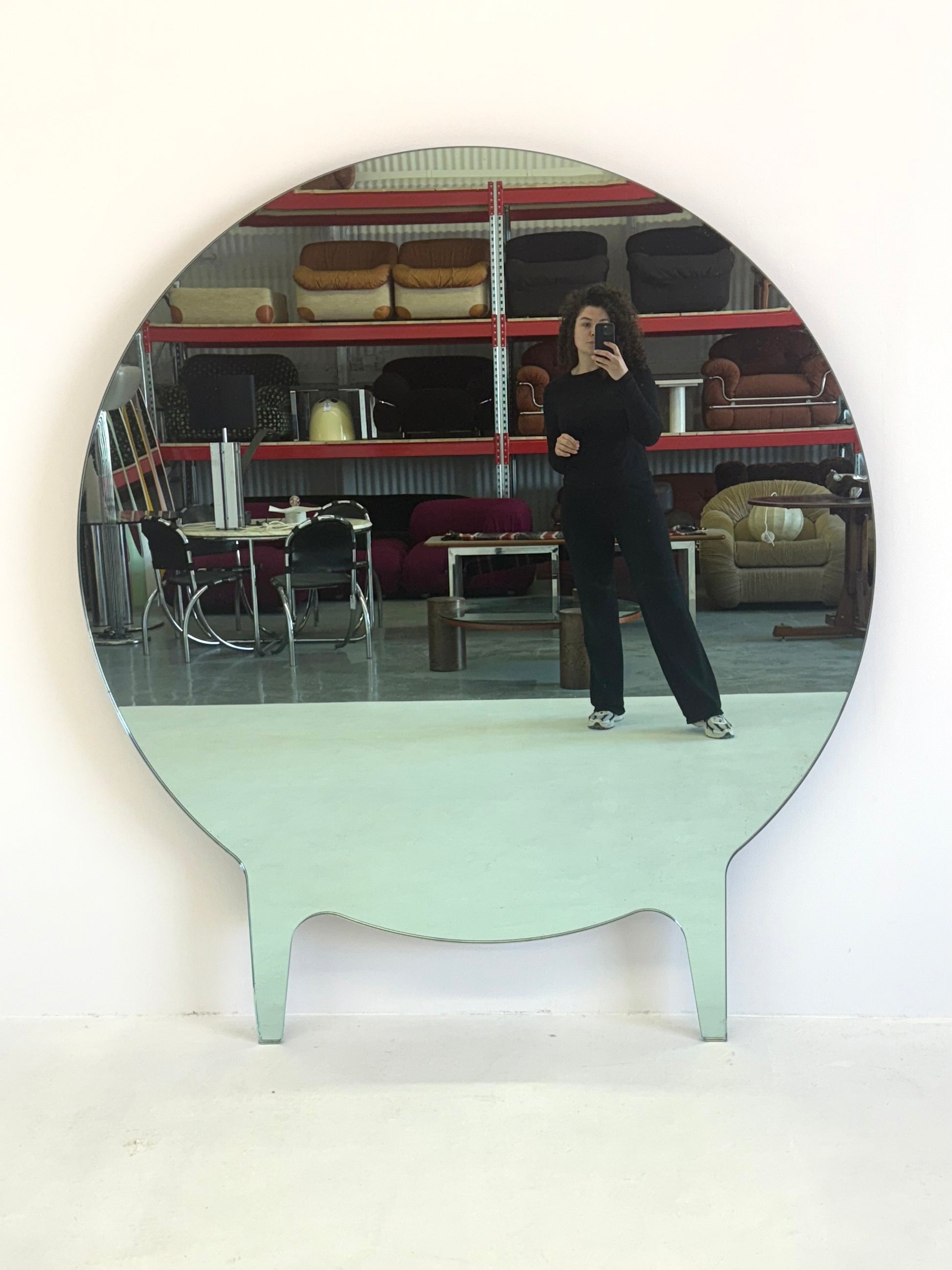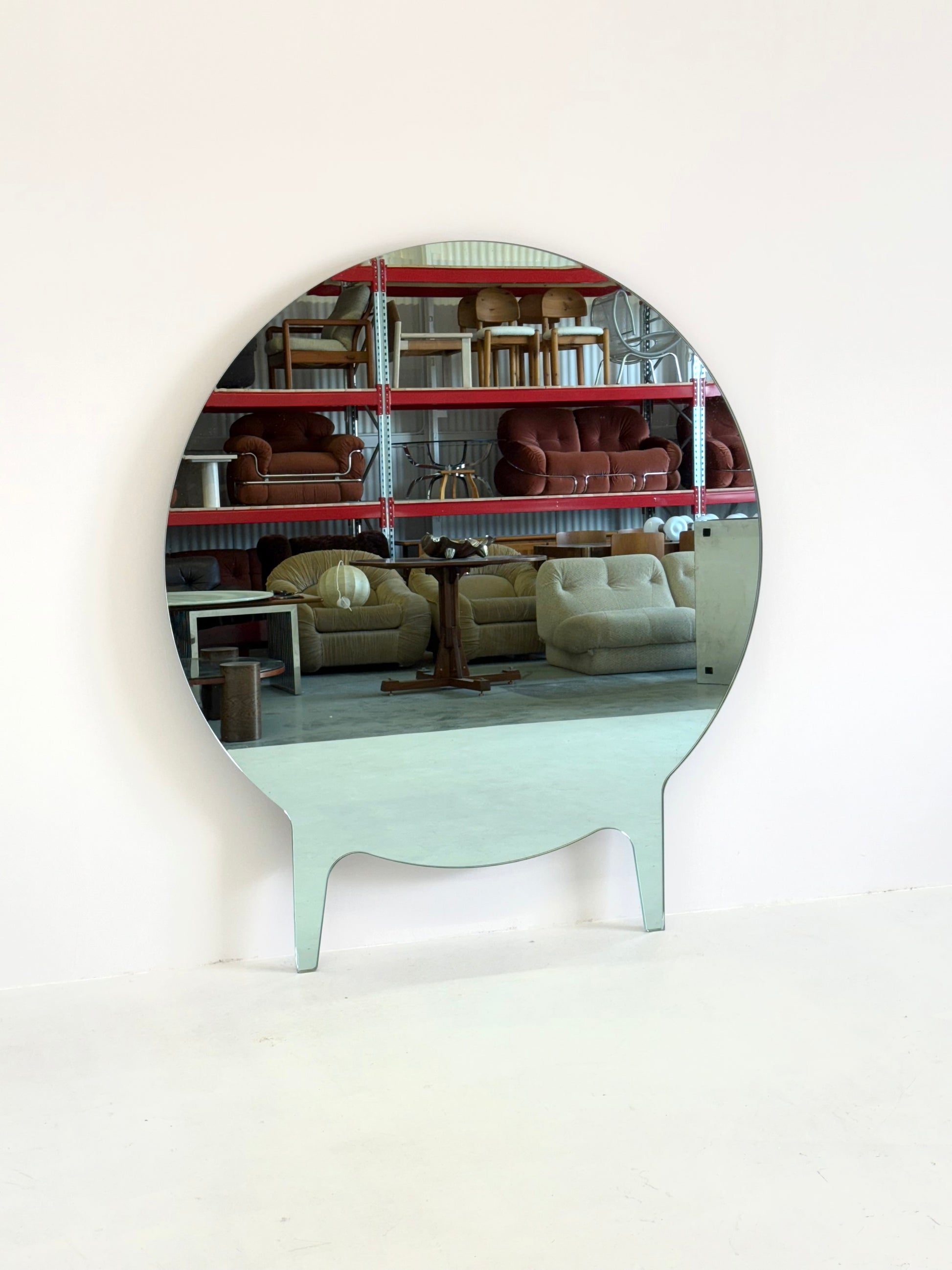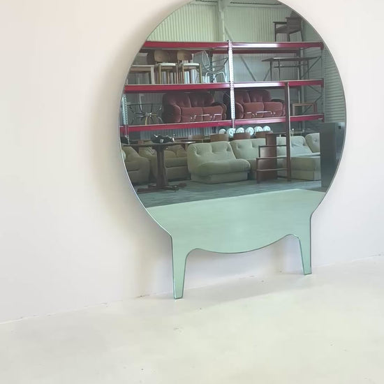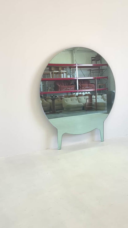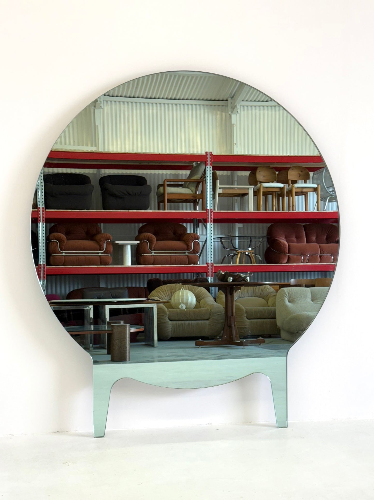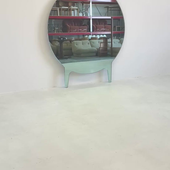 Een indrukwekkende staande spiegel met volledig doorlopende pootjes die op elegante wijze opgaan in het ronde design. De spiegel is een echte eye-catcher en brengt een sterke space age uitstraling met zich mee.