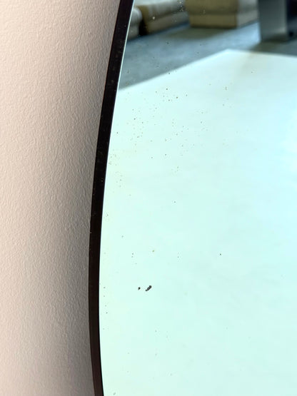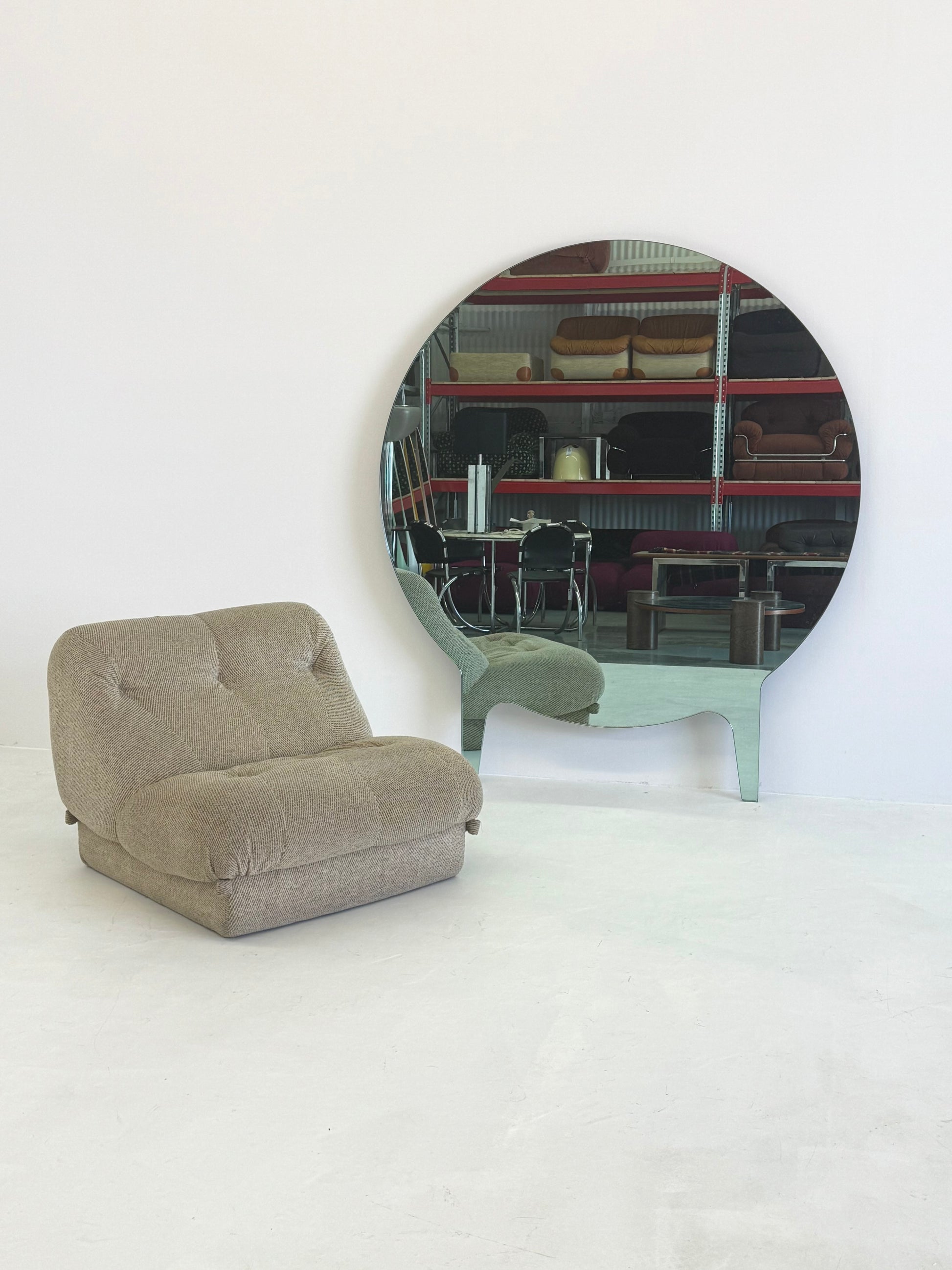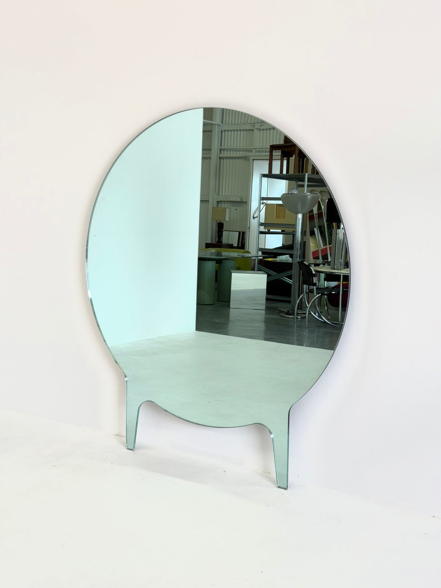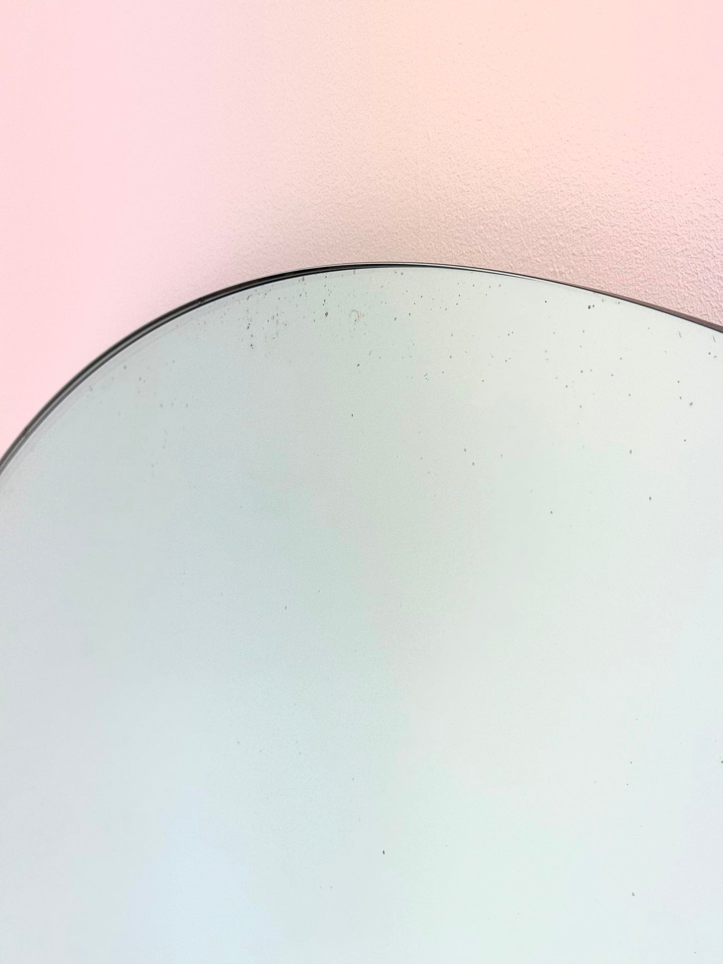 Een indrukwekkende staande spiegel met volledig doorlopende pootjes die op elegante wijze opgaan in het ronde design. De spiegel is een echte eye-catcher en brengt een sterke space age uitstraling met zich mee.