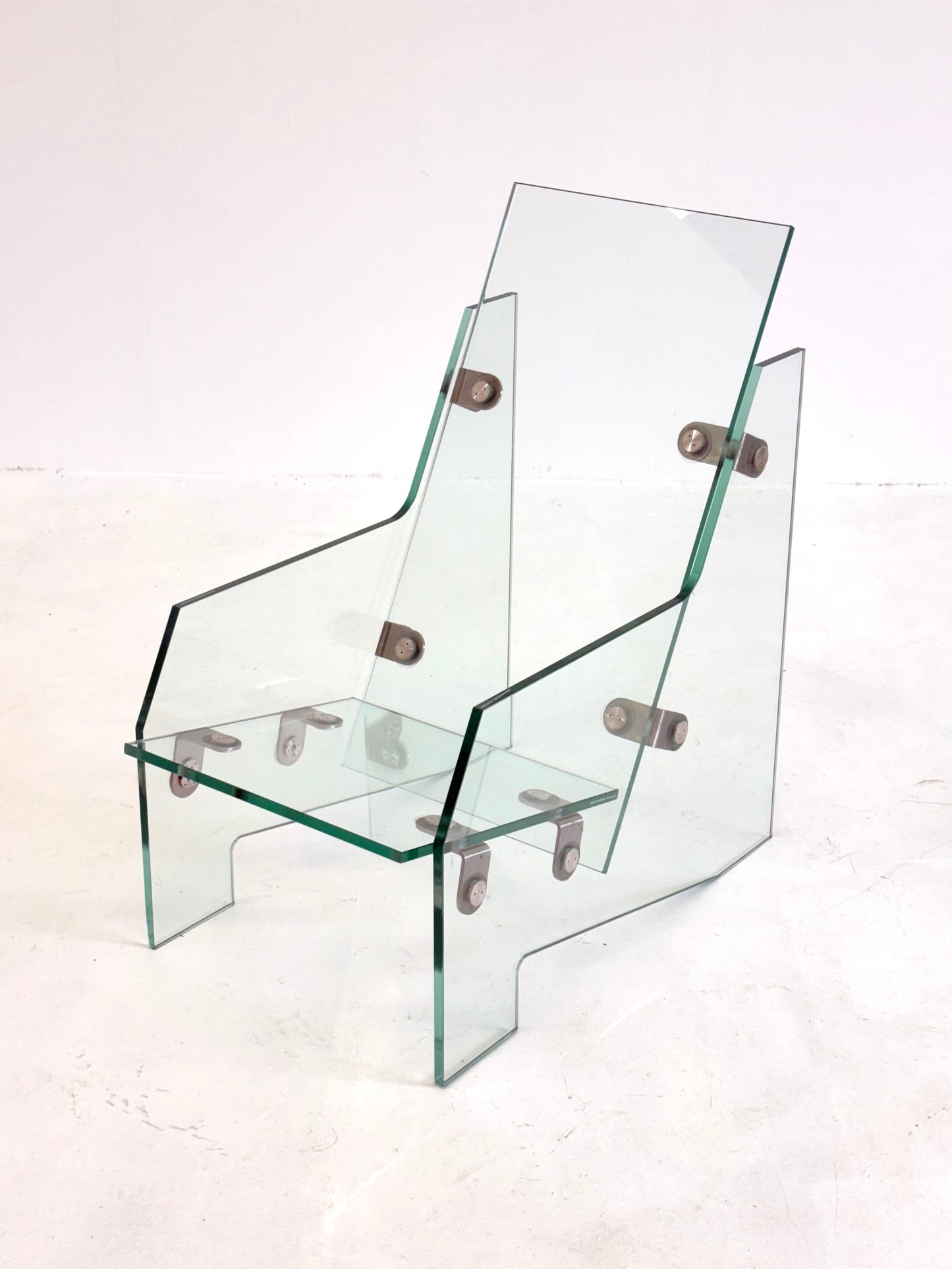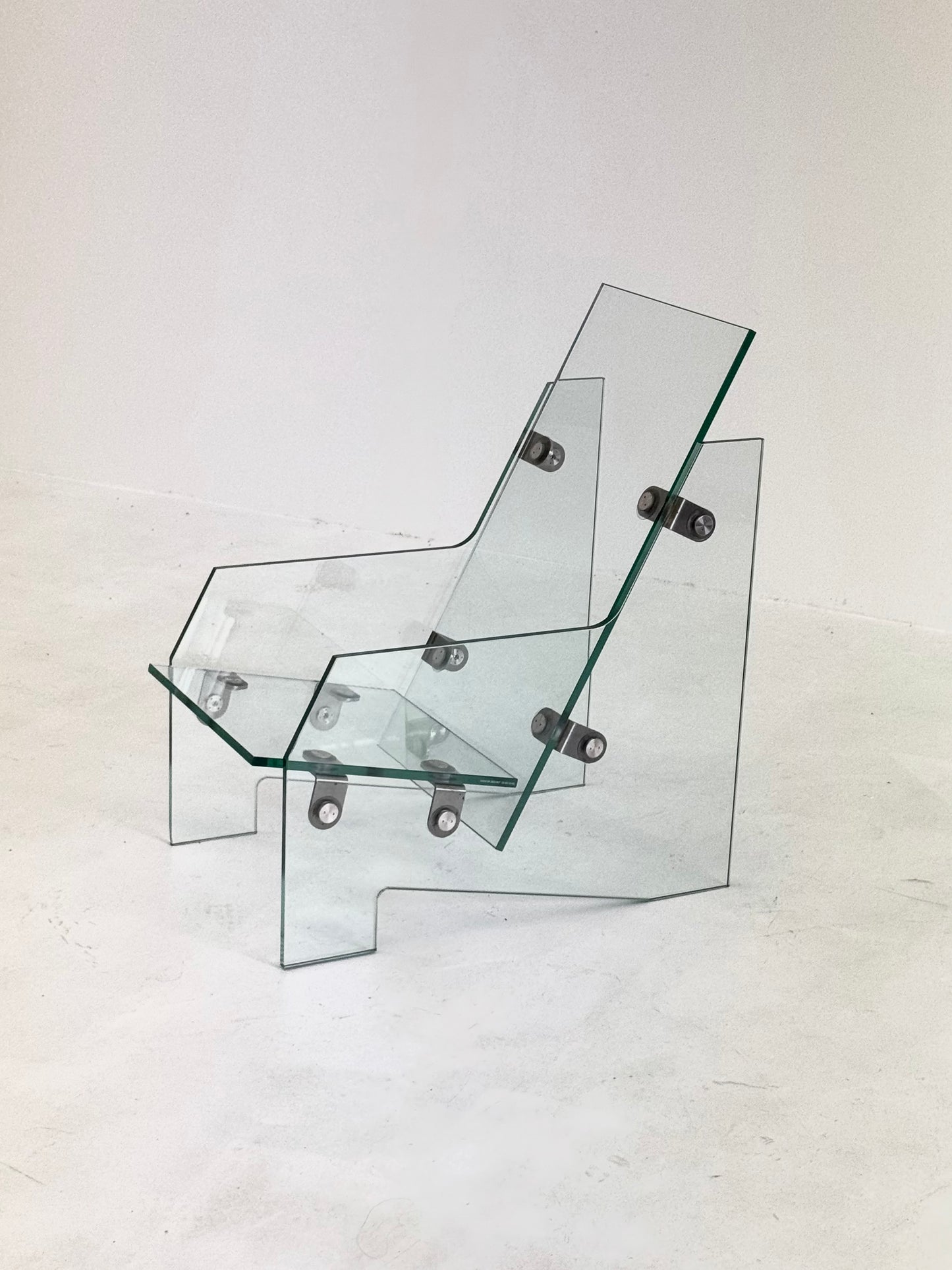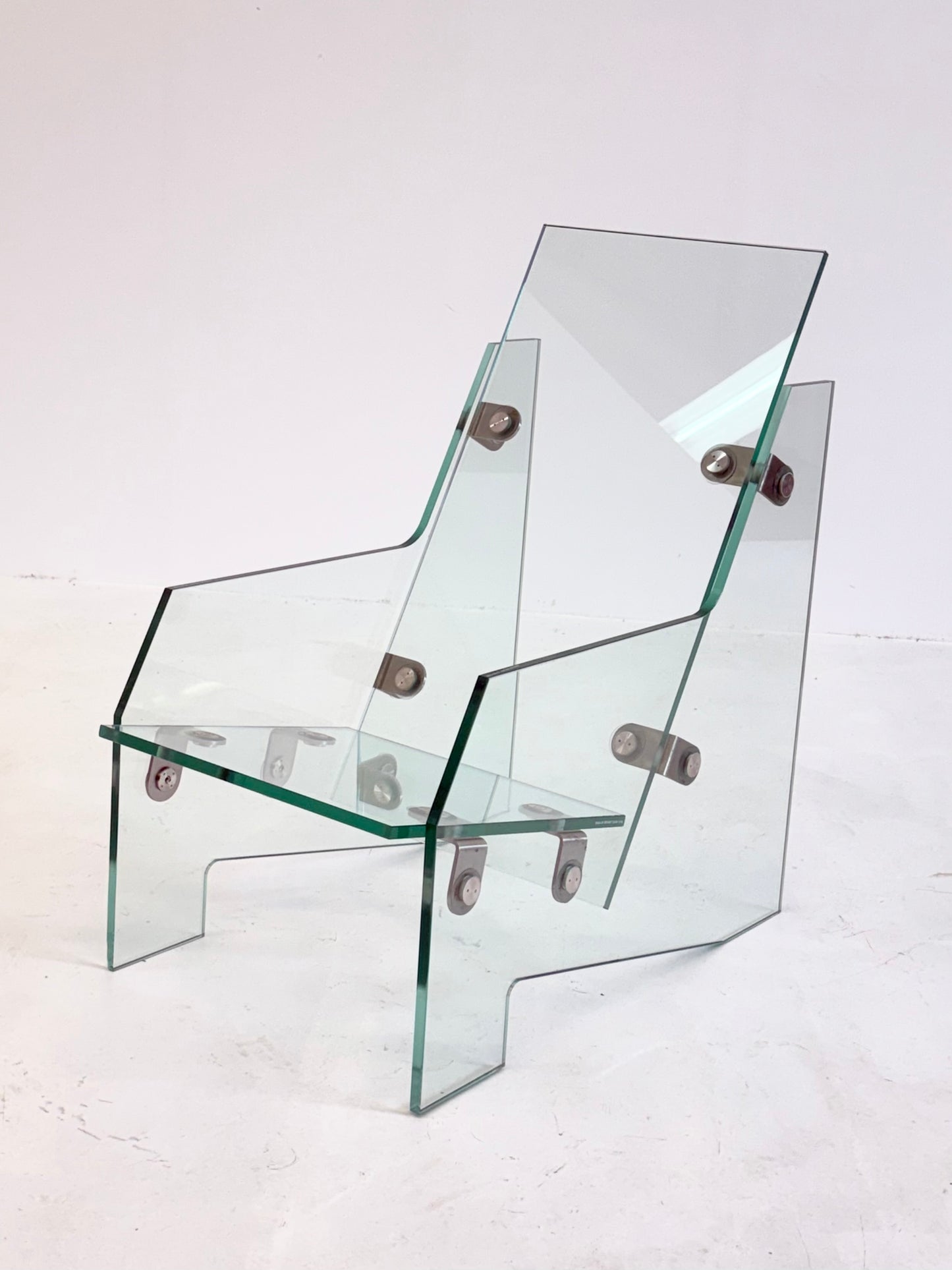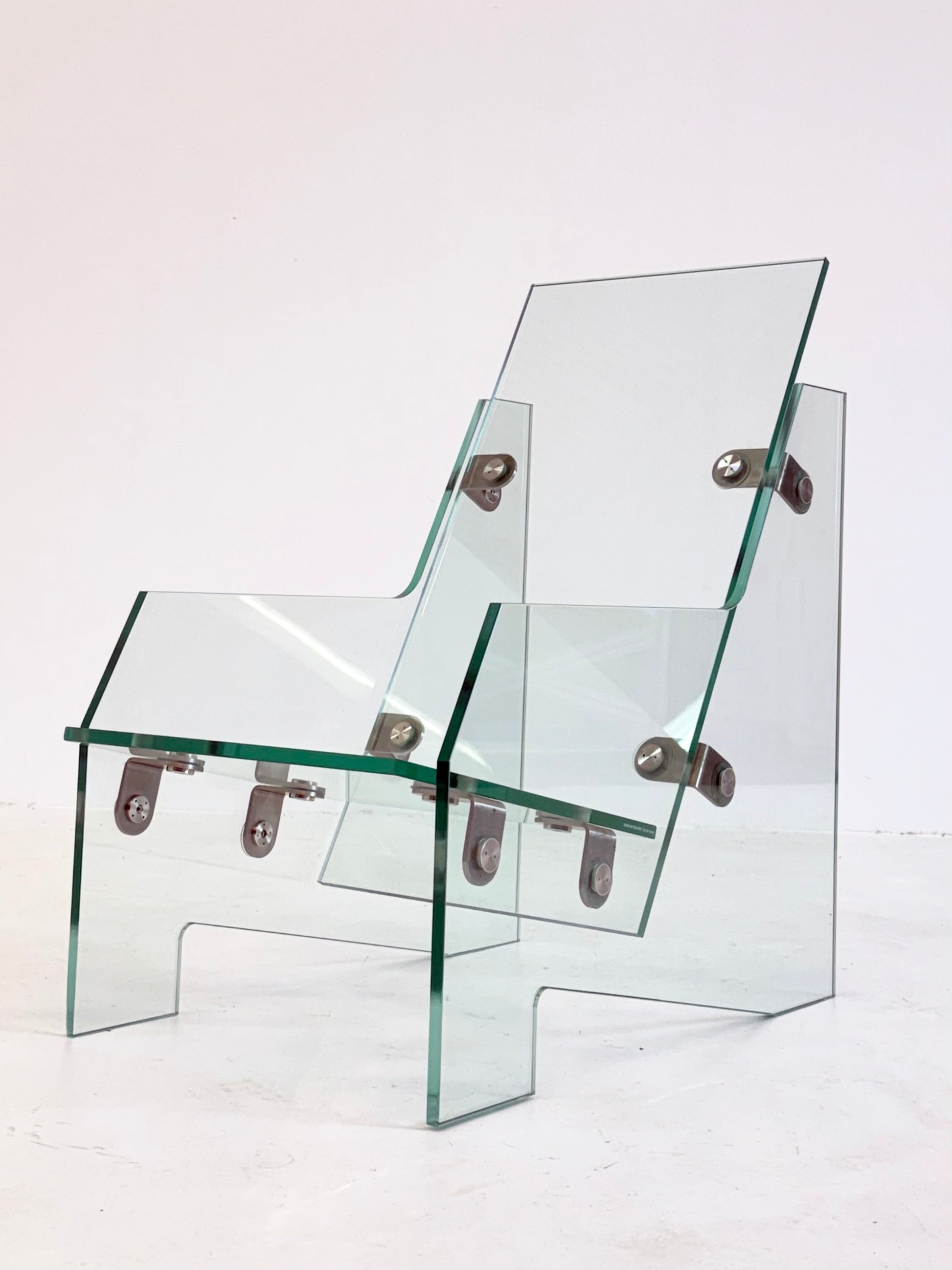 Een unieke en uitzonderlijke vondst: deze stoel is volledig vervaardigd uit gehard glas. Ondanks zijn fragiele uitstraling is het een bijzonder stevig object – volgens de maker zelfs sterk genoeg om op te staan.