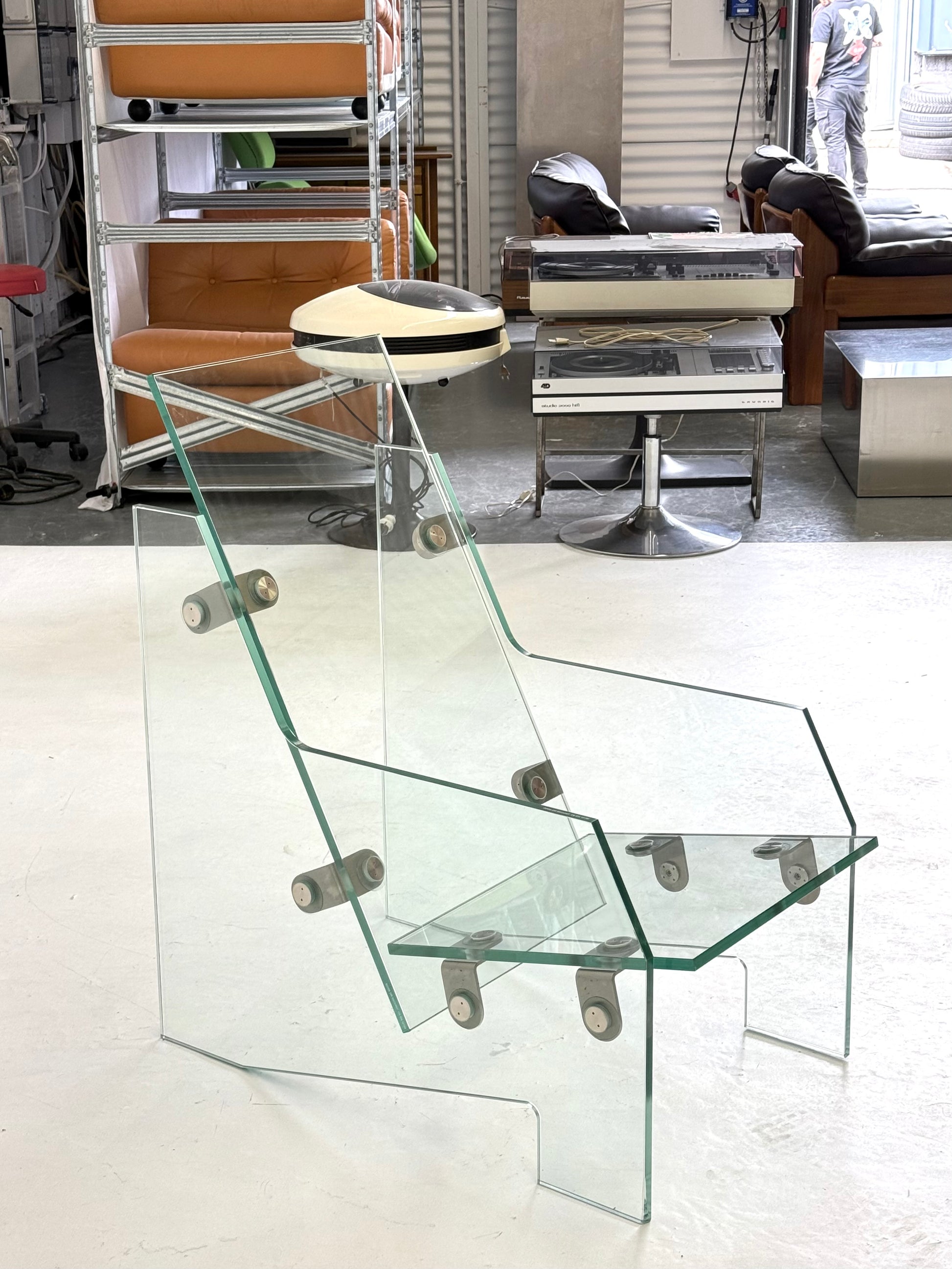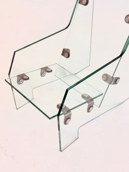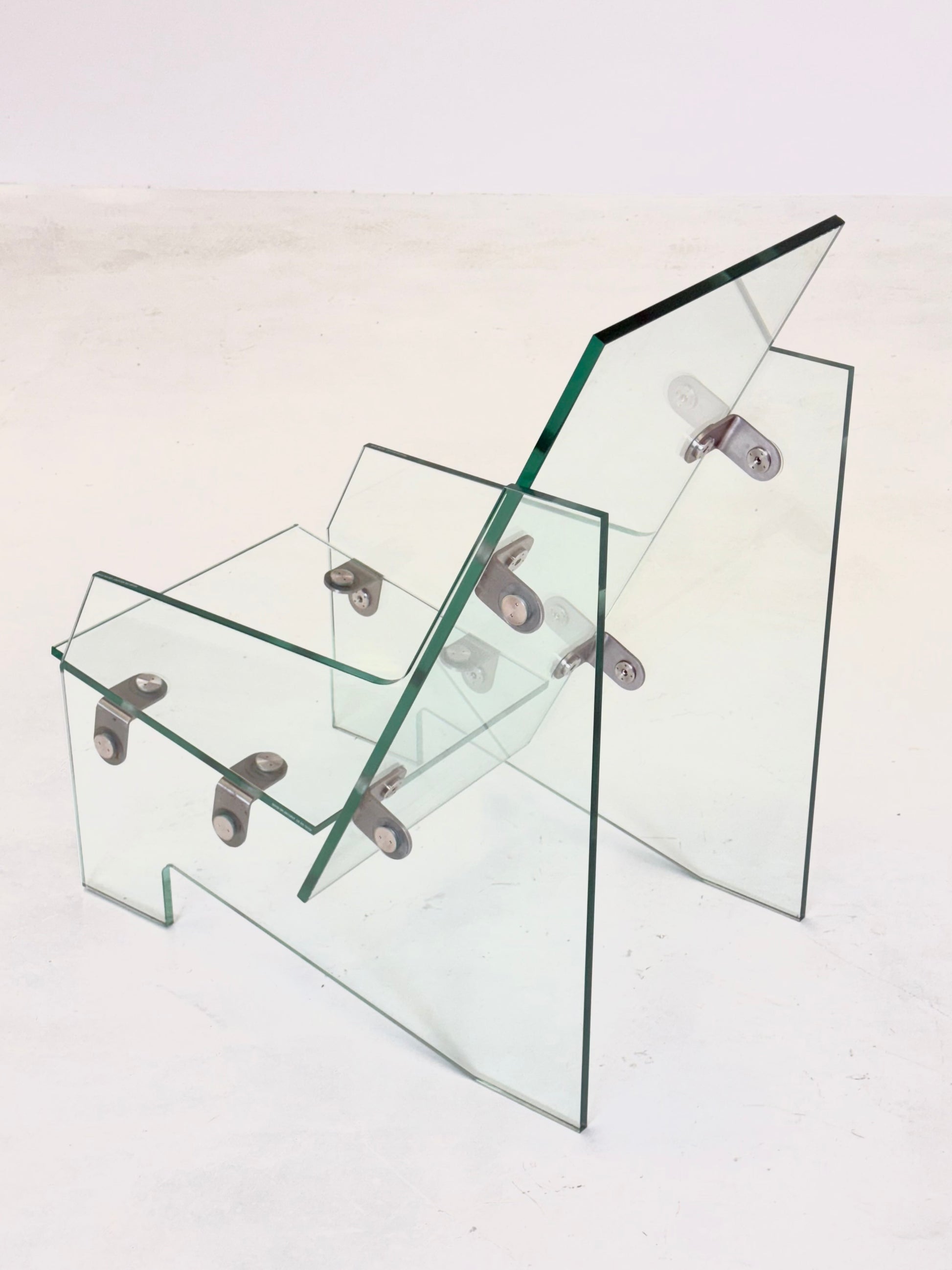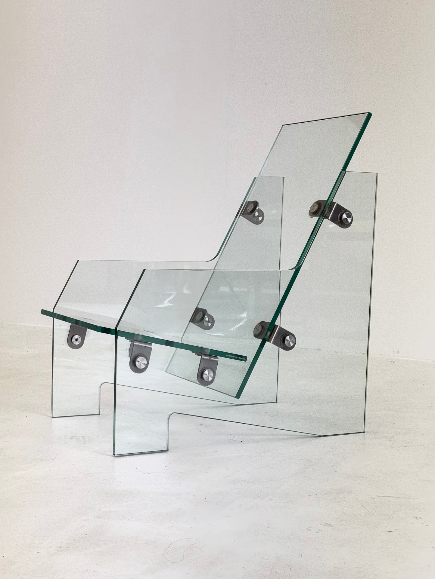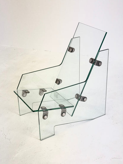 Een unieke en uitzonderlijke vondst: deze stoel is volledig vervaardigd uit gehard glas. Ondanks zijn fragiele uitstraling is het een bijzonder stevig object – volgens de maker zelfs sterk genoeg om op te staan.