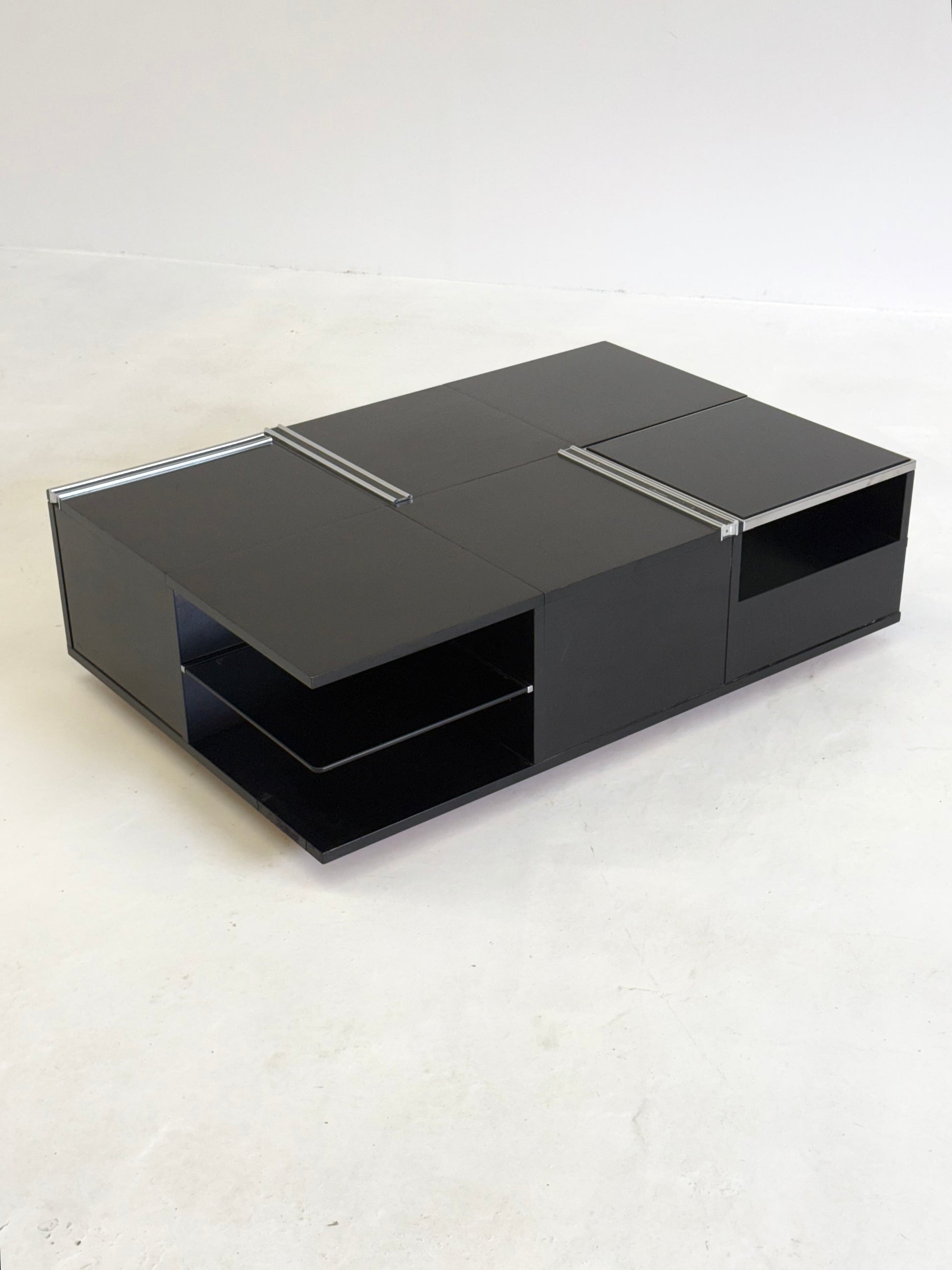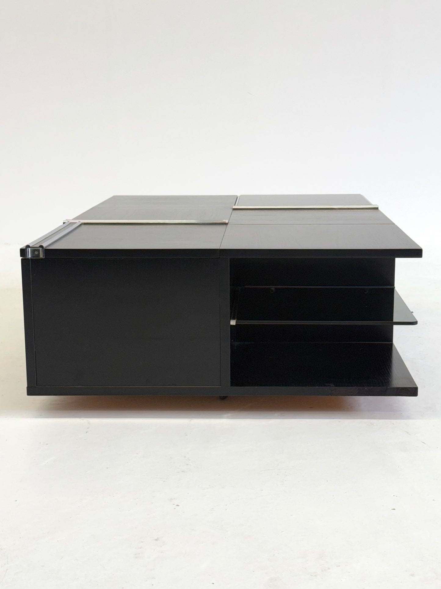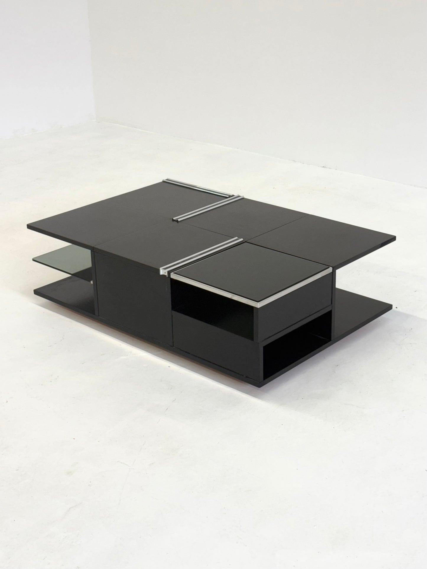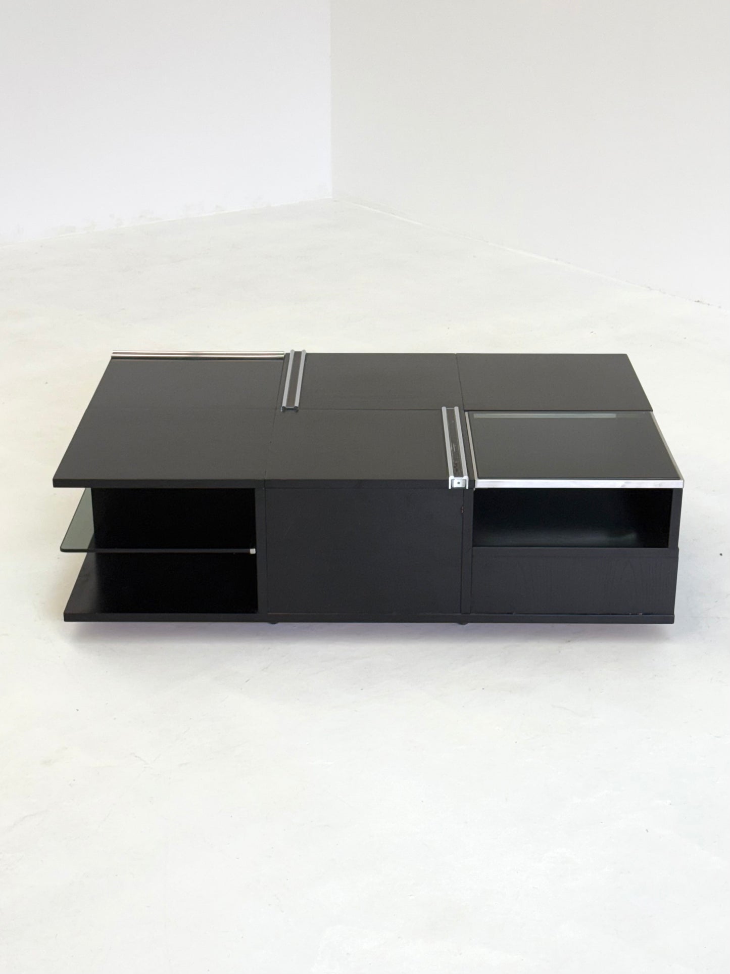 Daarnaast beschikt de salontafel over drie klepdeurtjes die extra opbergruimte bieden. Eén hoek van de tafel is voorzien van een glazen blad, terwijl in een andere hoek een glazen plankje is geïntegreerd. Deze combinatie van materialen en vormen maakt het geheel tot een bijzonder en veelzijdig ontwerp.