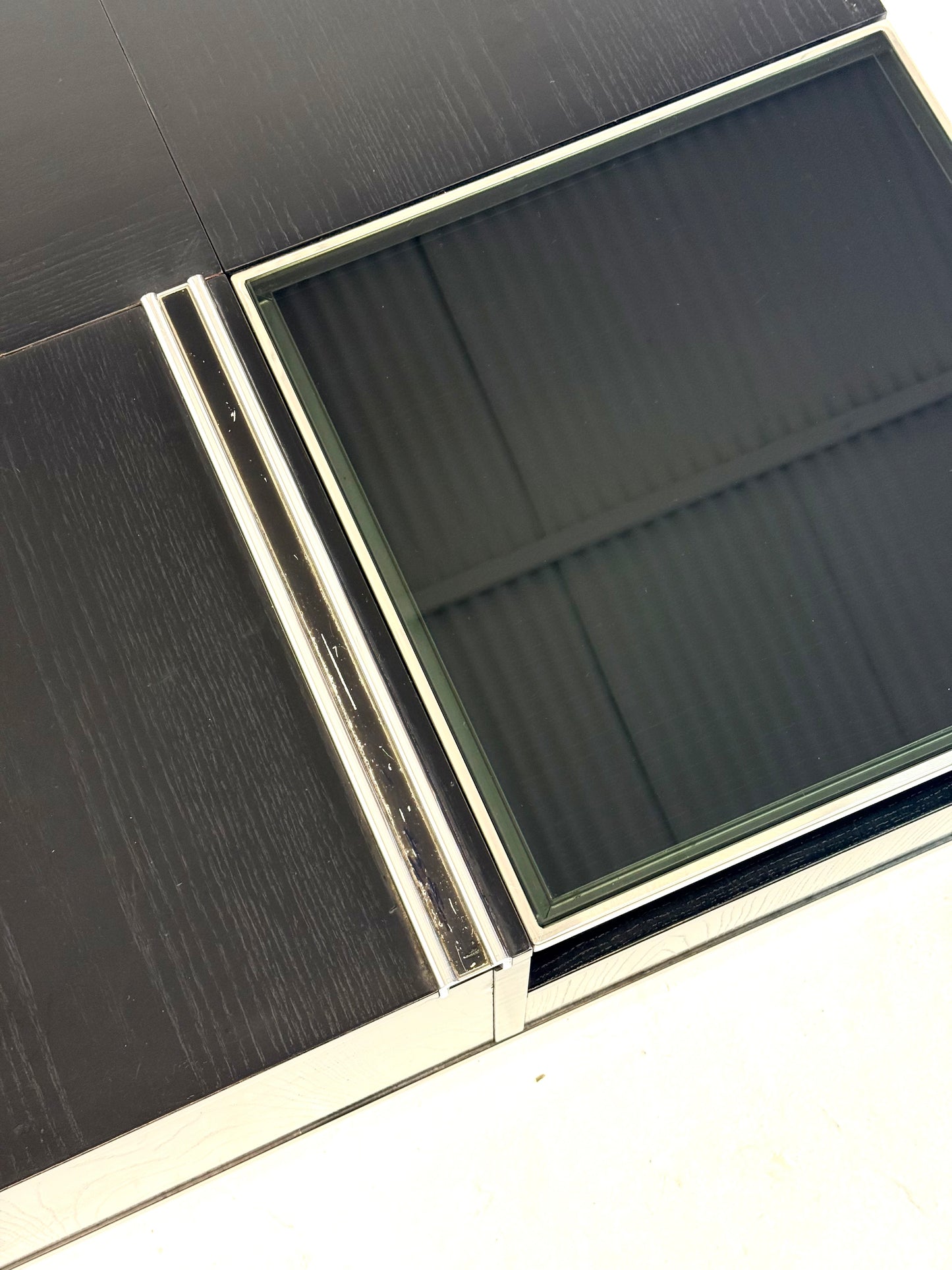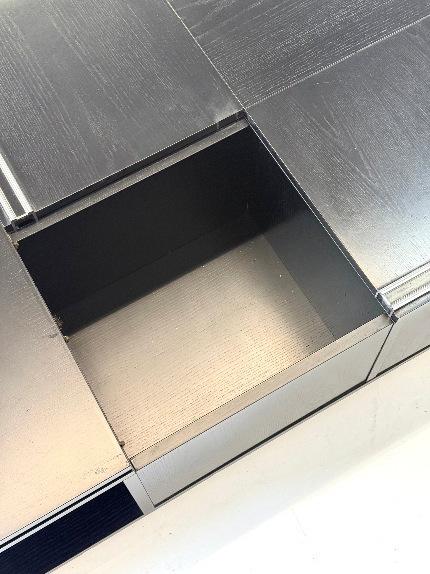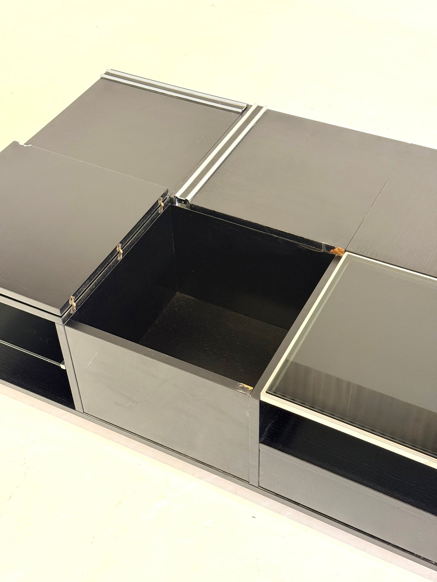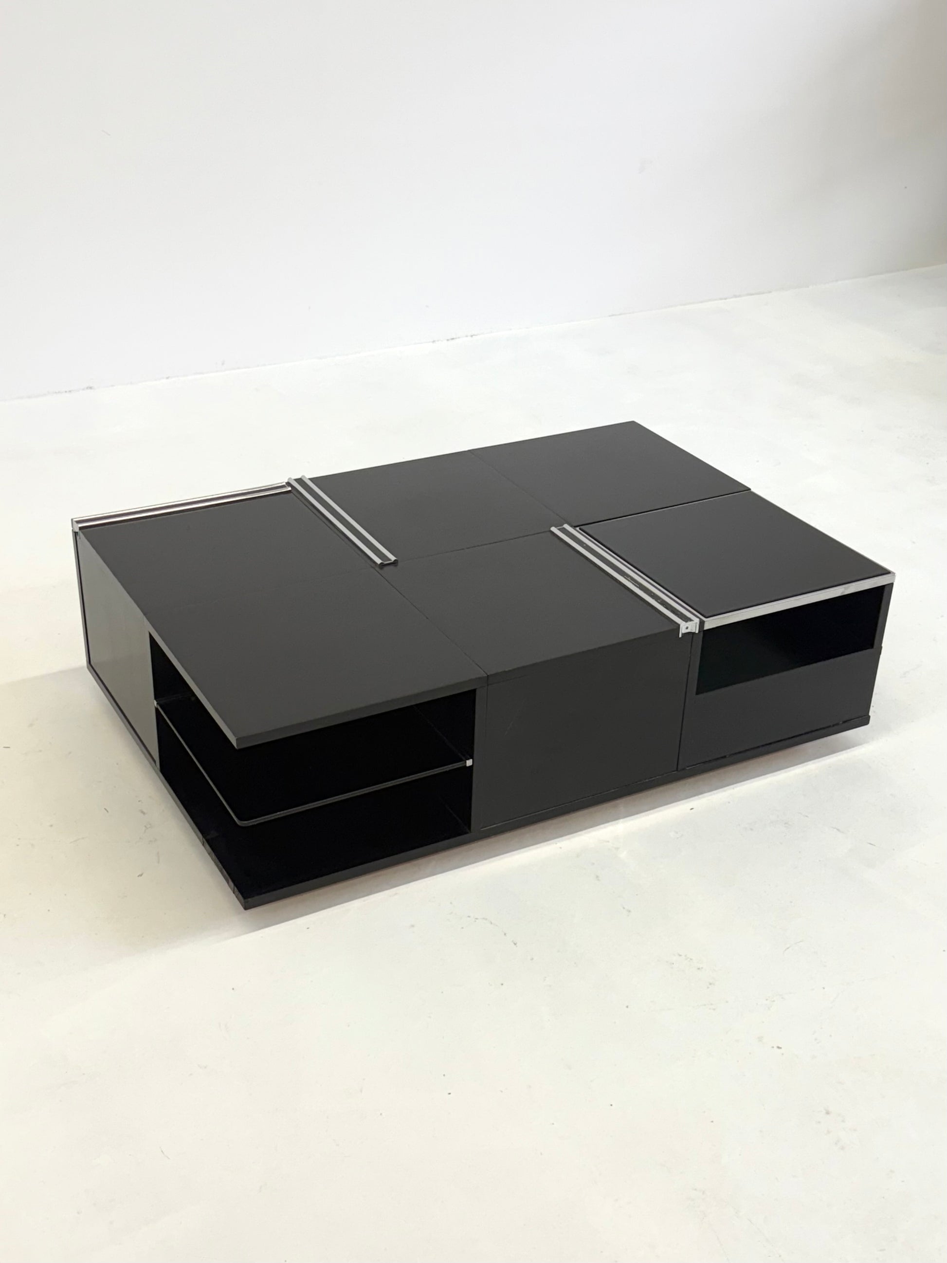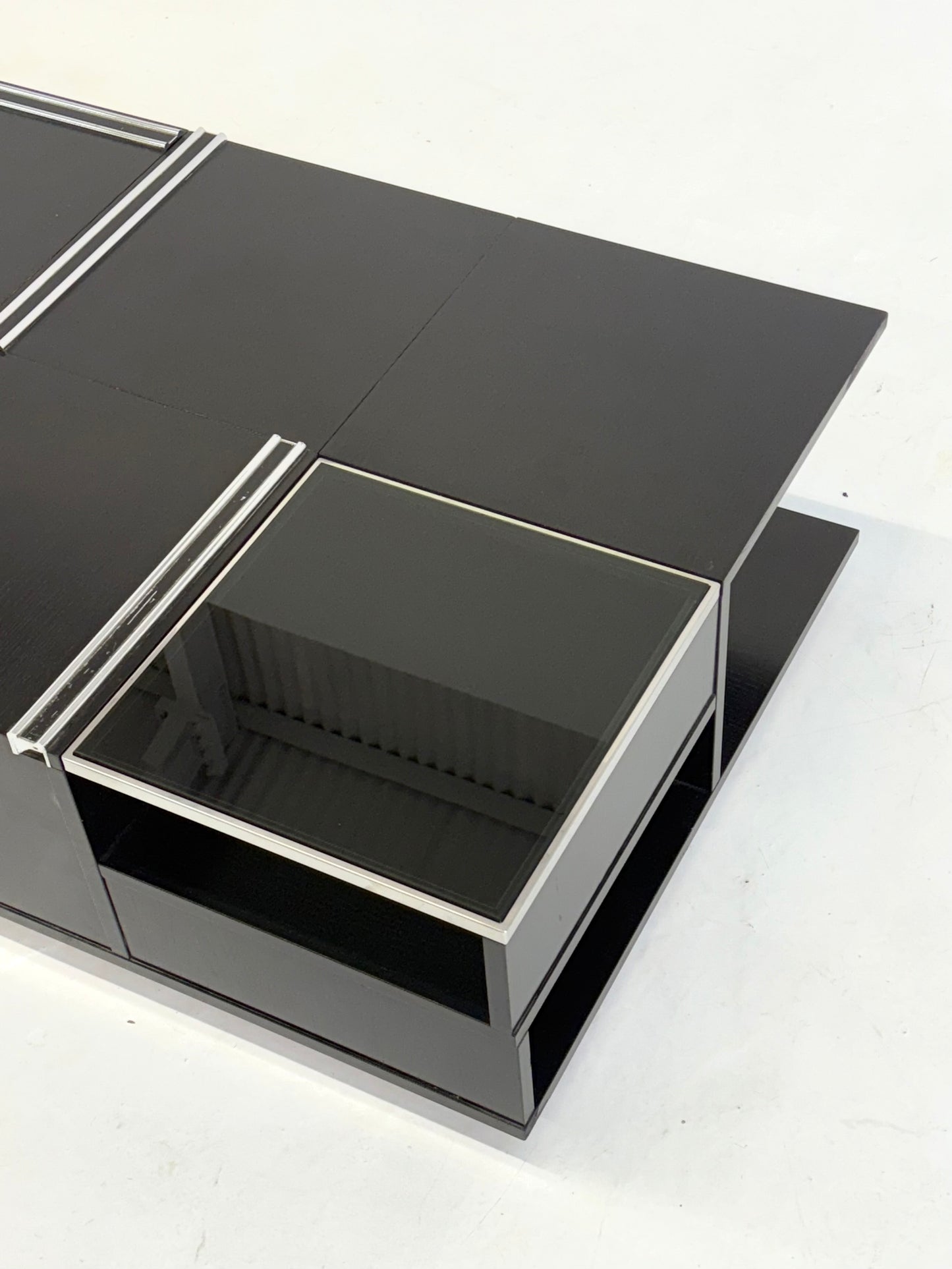 Daarnaast beschikt de salontafel over drie klepdeurtjes die extra opbergruimte bieden. Eén hoek van de tafel is voorzien van een glazen blad, terwijl in een andere hoek een glazen plankje is geïntegreerd. Deze combinatie van materialen en vormen maakt het geheel tot een bijzonder en veelzijdig ontwerp.