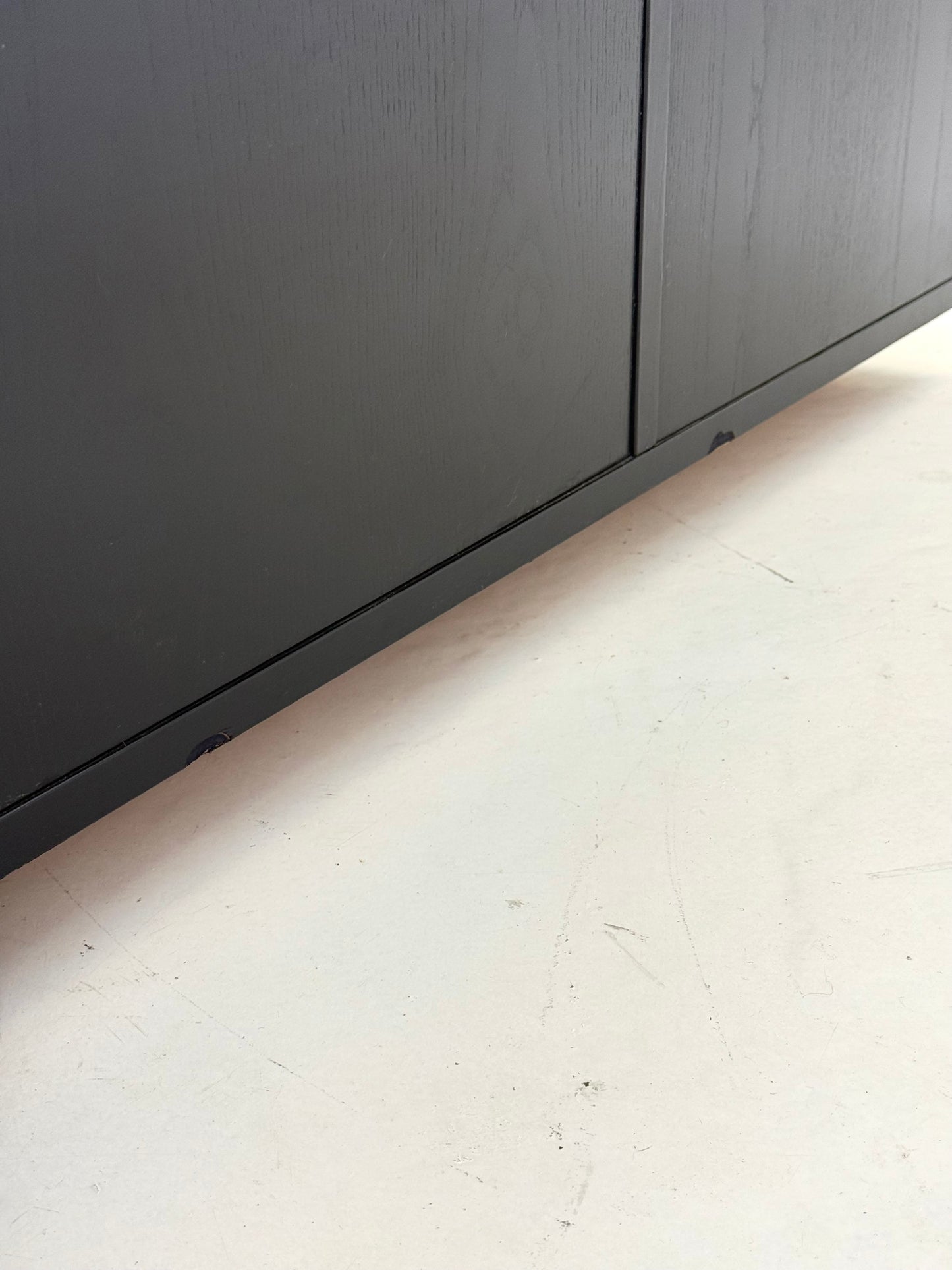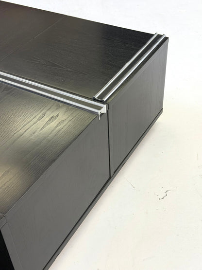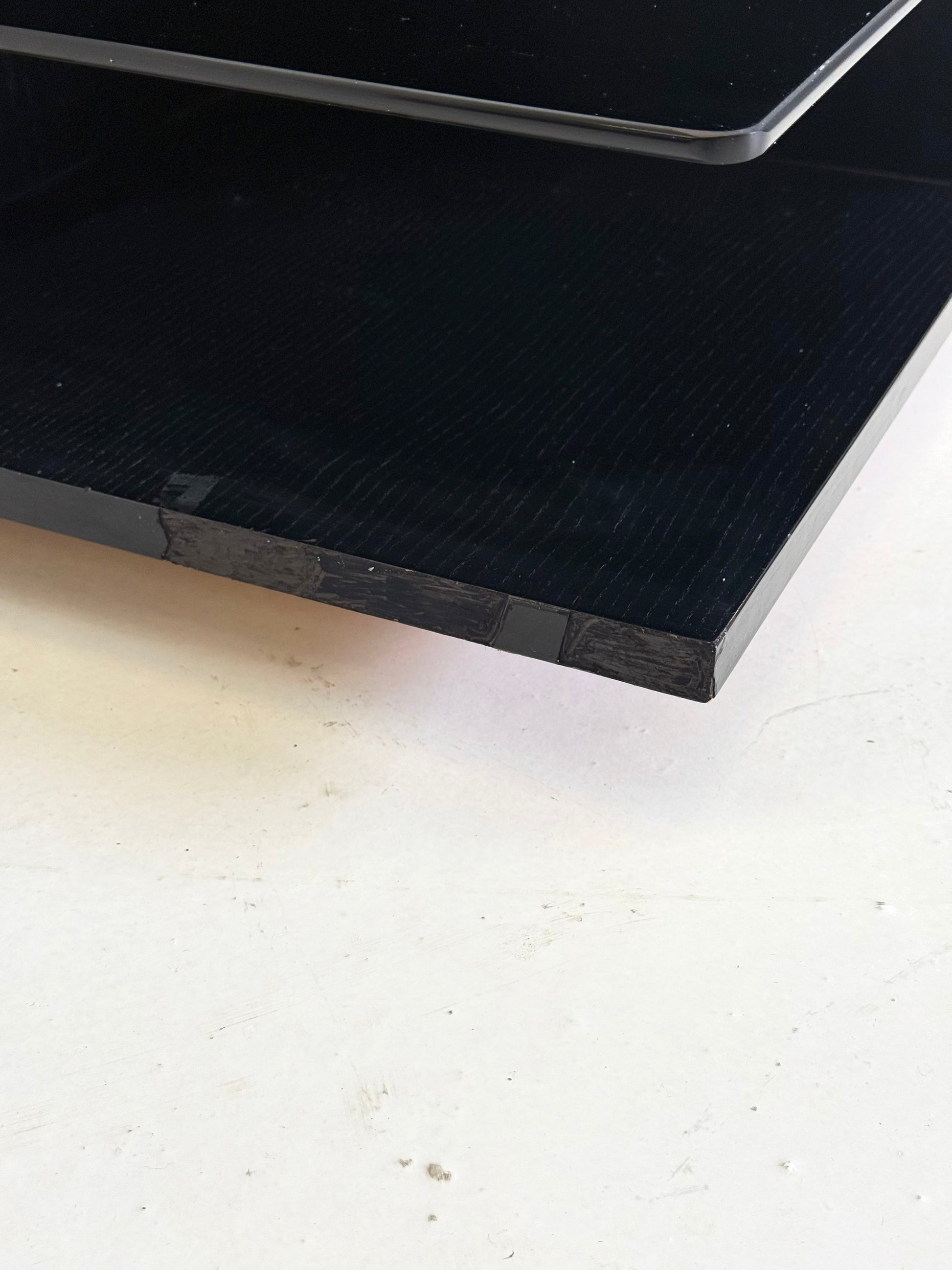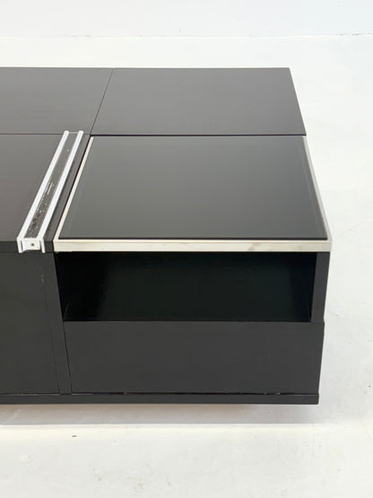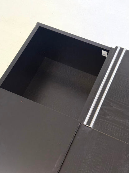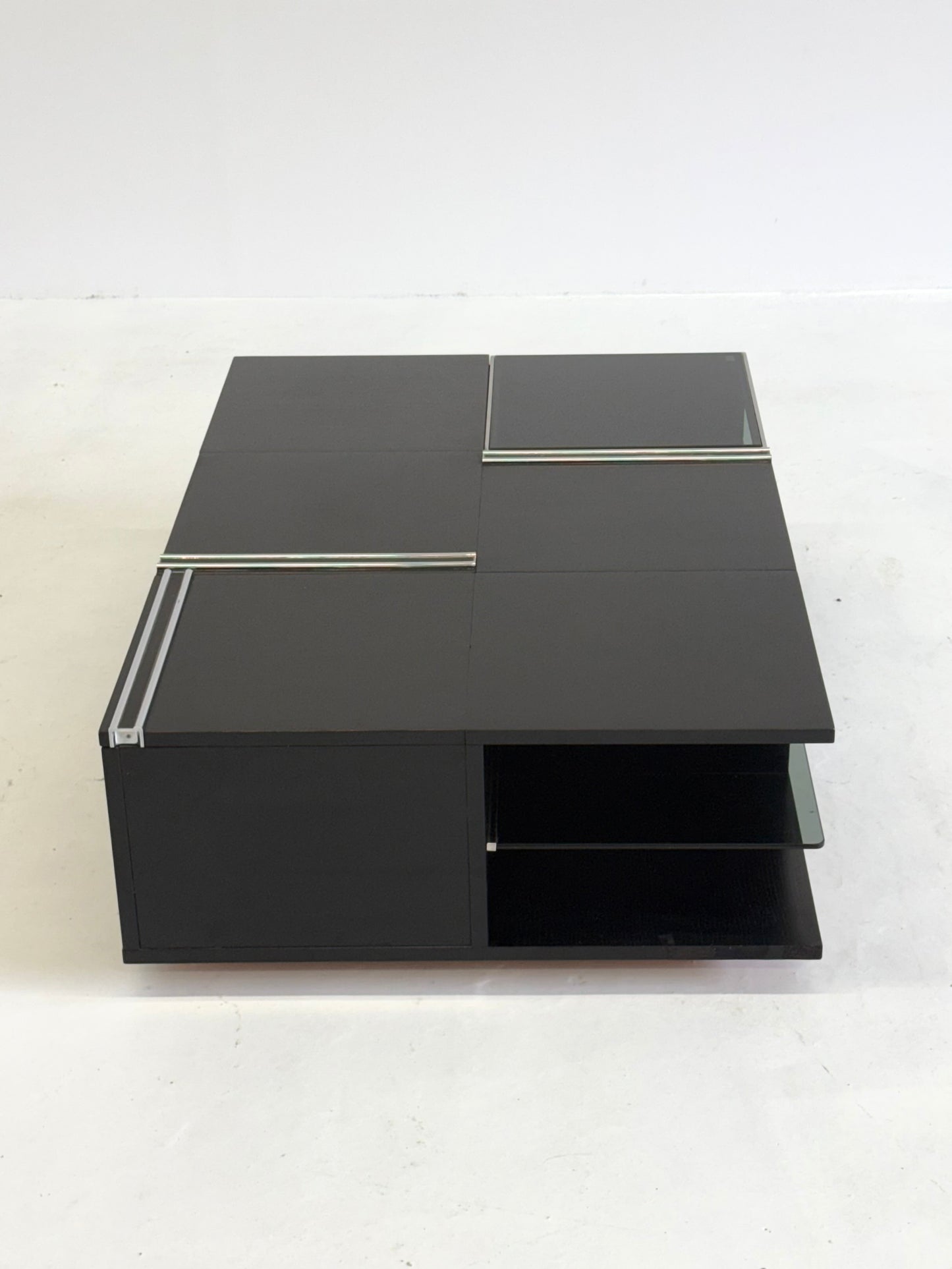 Rechthoekige salontafel uit Italië, ontworpen door het merk Fiarm. De tafel is uitgevoerd in zwart gelakt hout en heeft stijlvolle chromen lijnen verwerkt in het blad. Deze subtiele accenten geven de tafel een grafisch en elegant karakter.